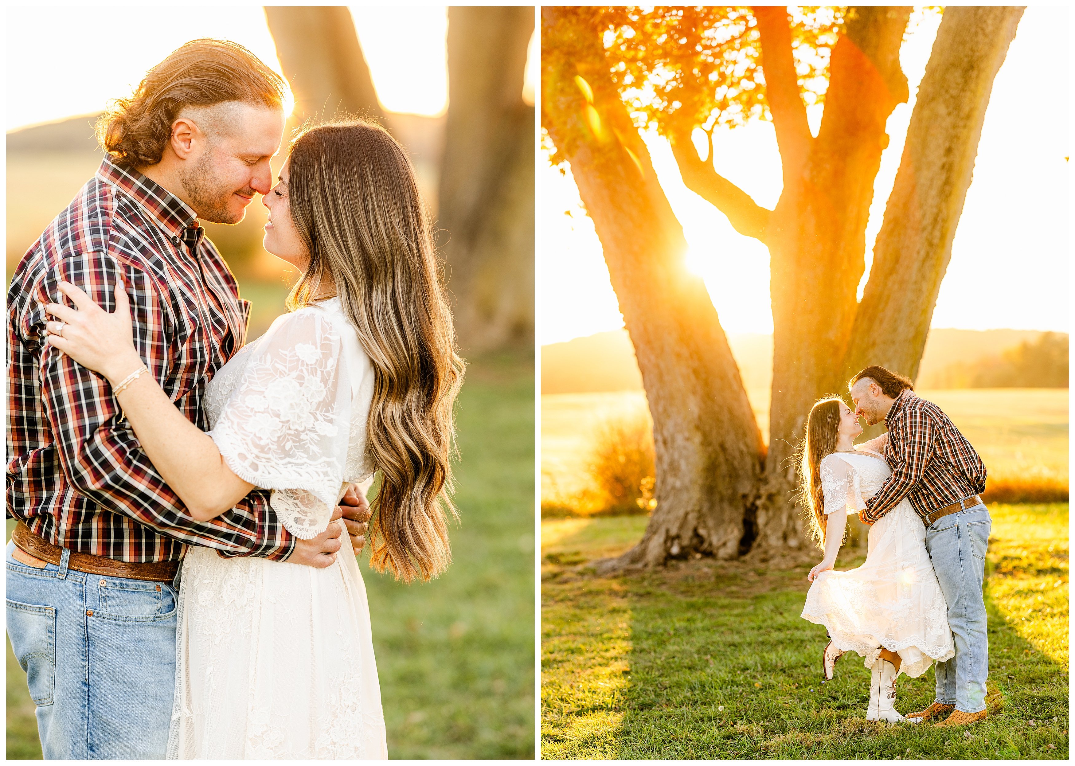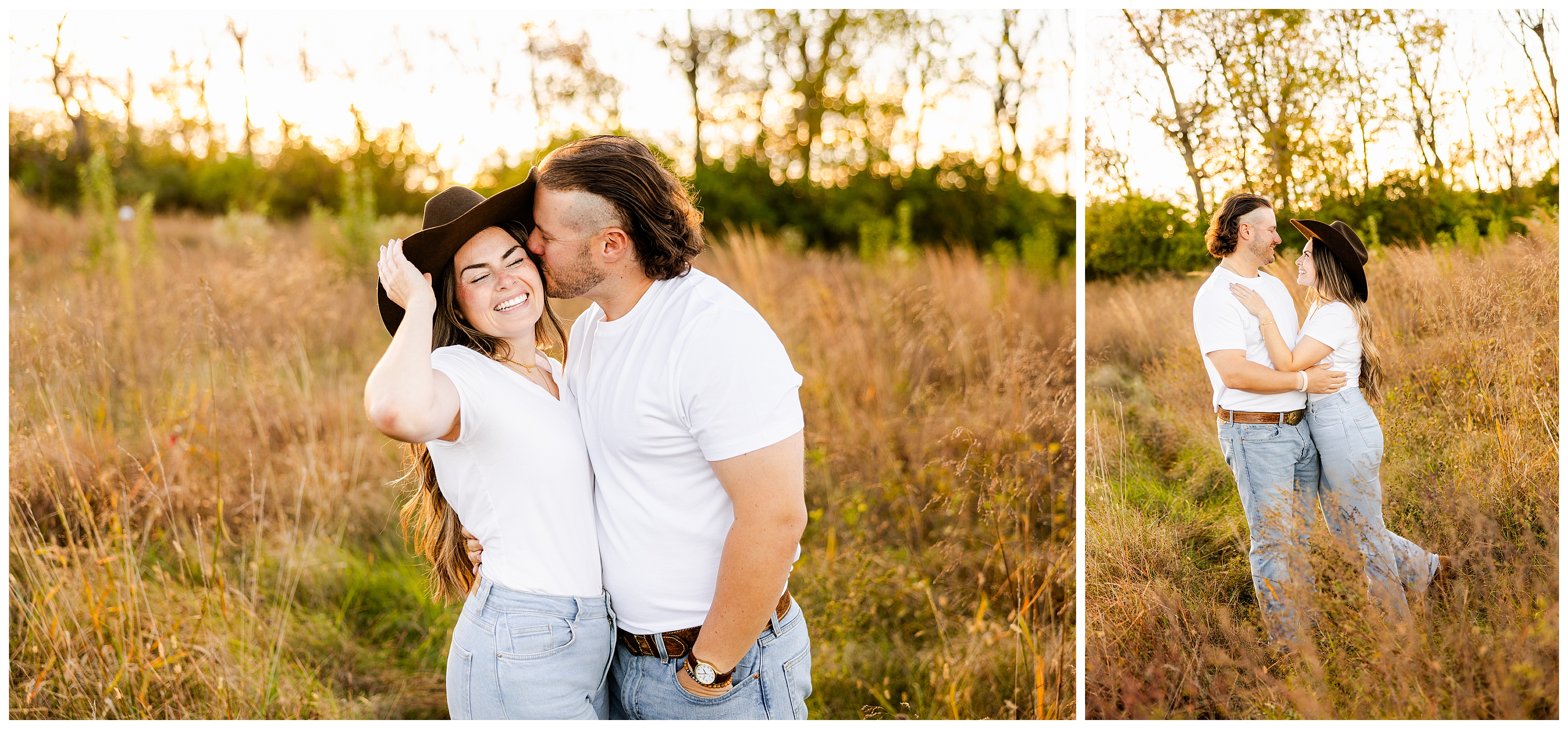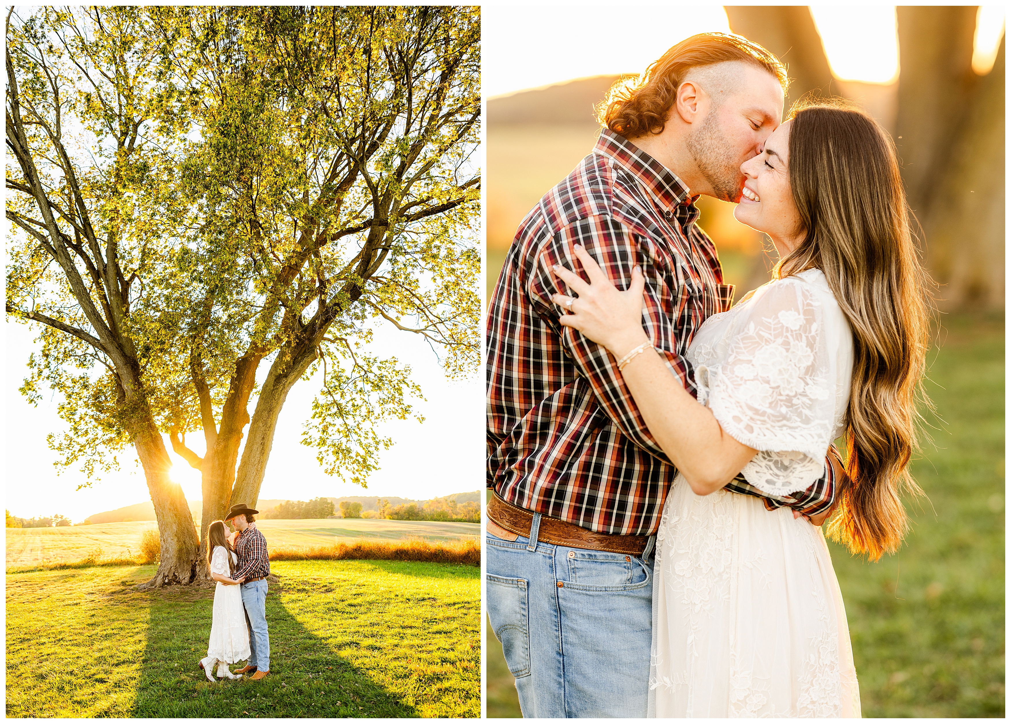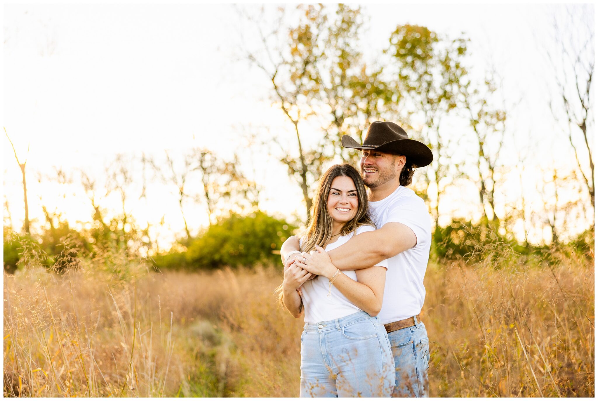 Leaning into a perfectly country vibe, Lou accessorized with his cowboy hat and they both wore boots that just felt effortlessly them. They started their session cuddling and laughing through the tall grass, completely playful and at ease with one another. They’re the kind of couple that feels genuine and down-to-earth from the moment you meet them — sweet, connected, and so clearly best friends. As golden hour deepened, we made our way to the tree Grace had fallen in love with, where the warm sunlight wrapped around them in the most romantic way.