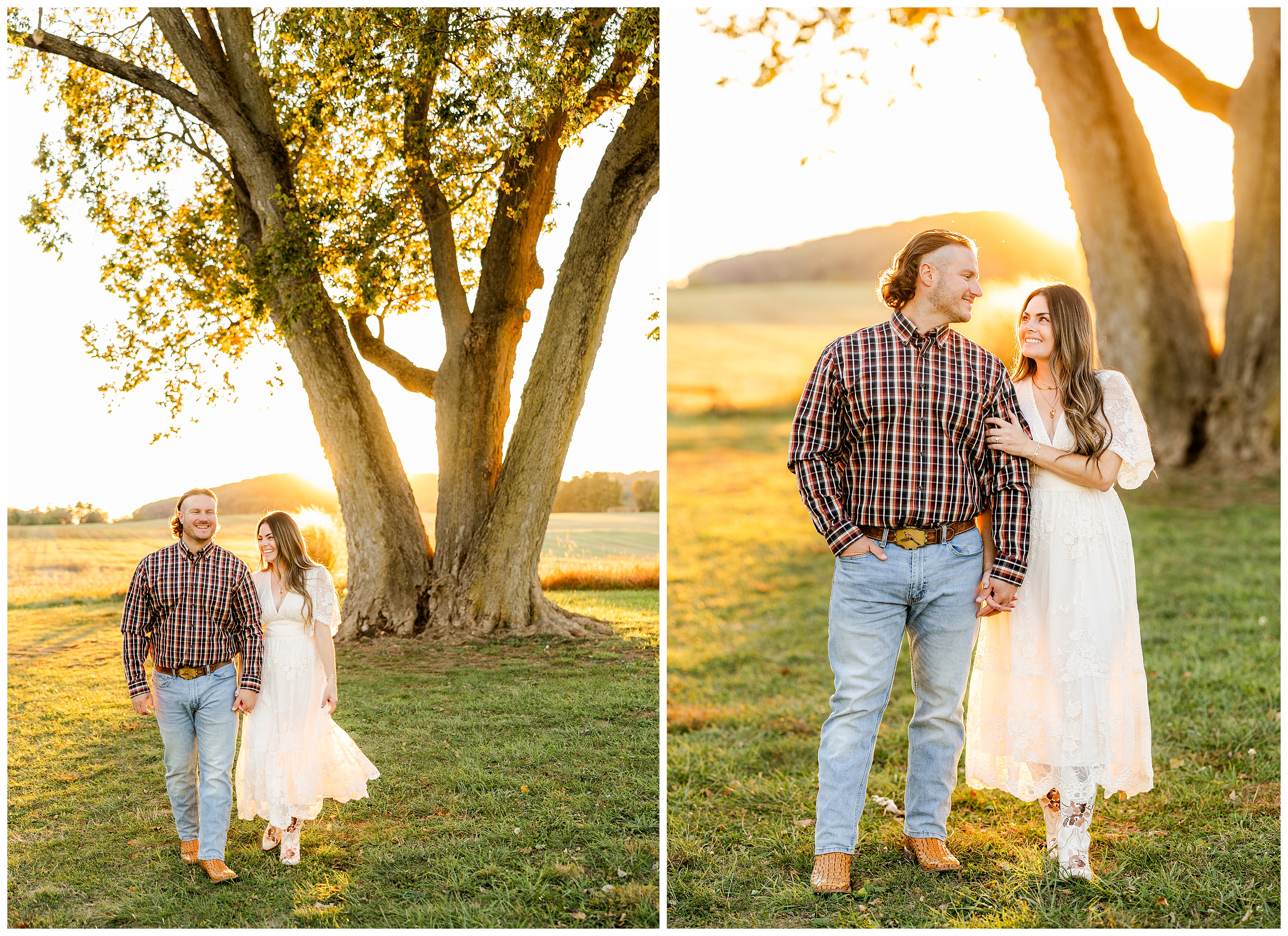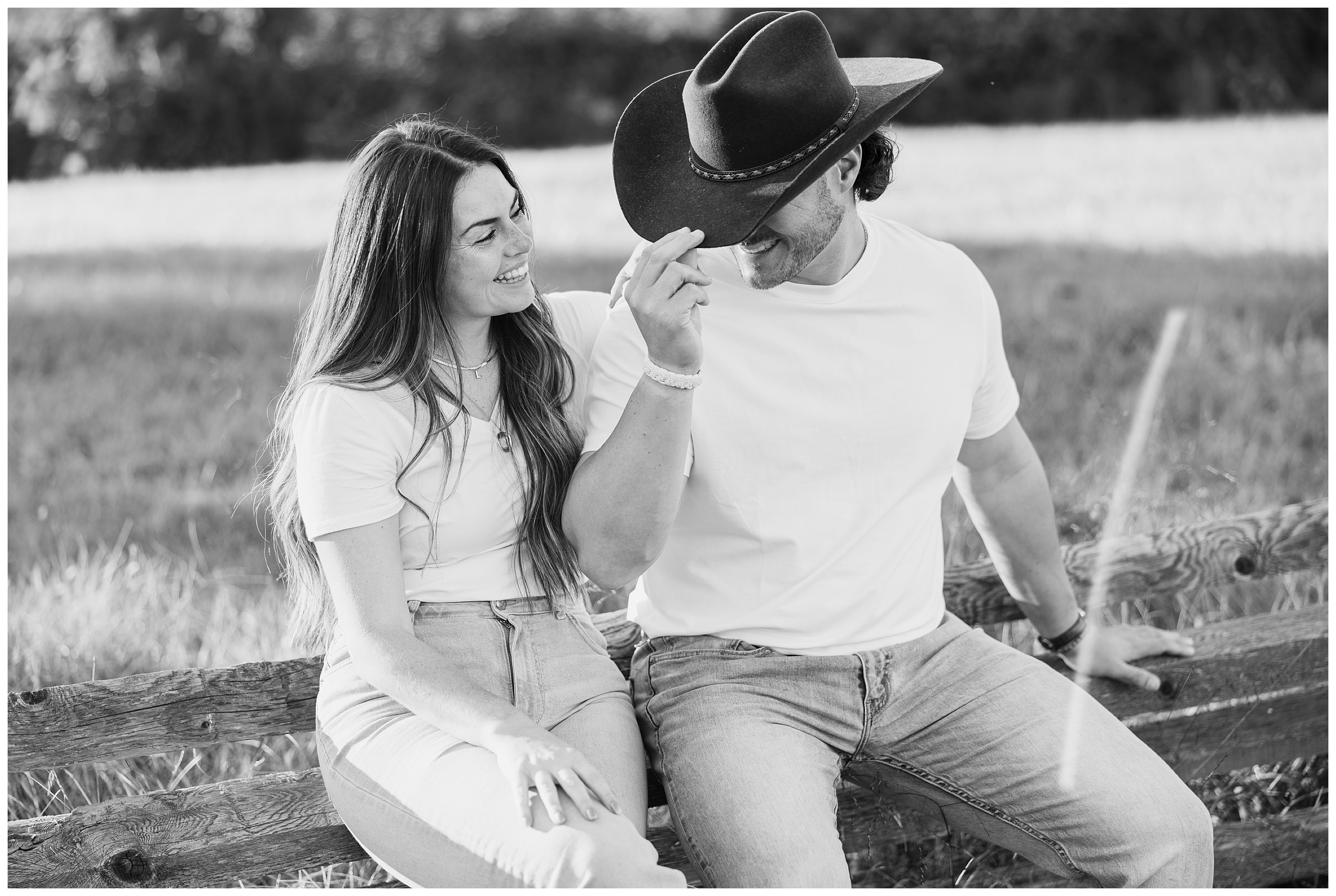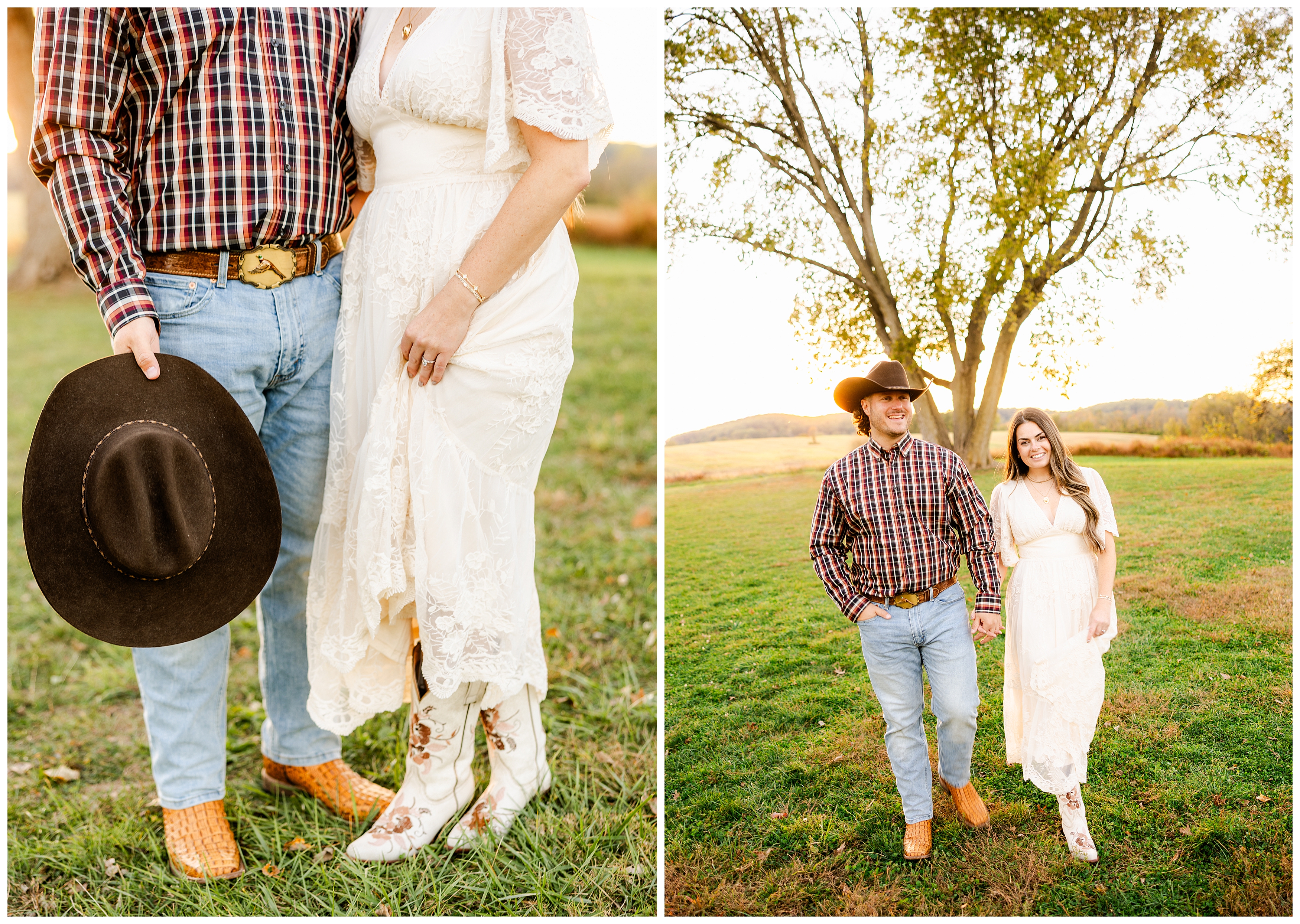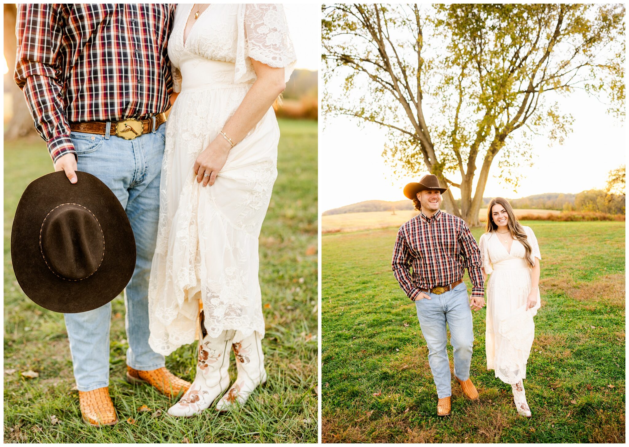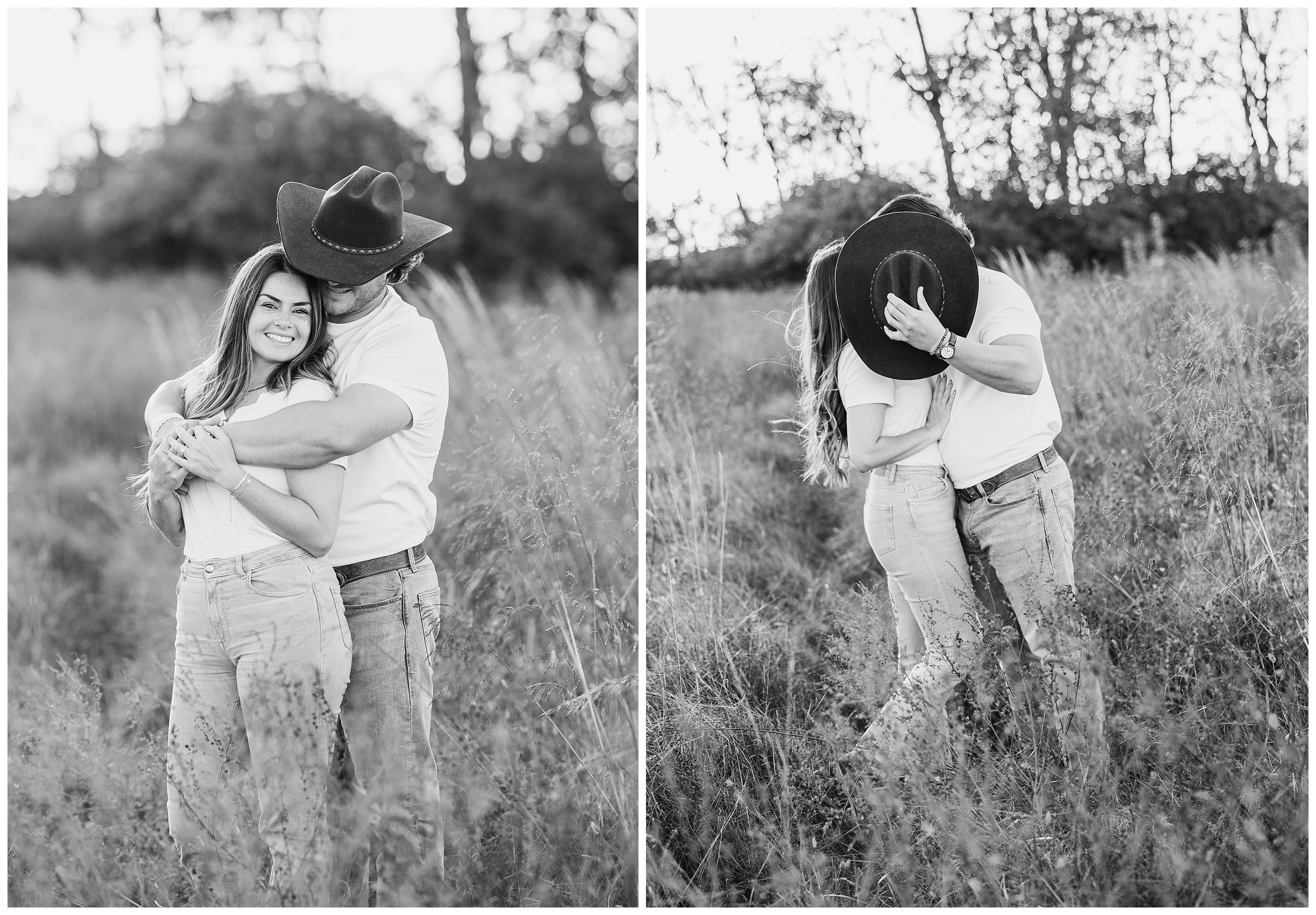 Leaning into a perfectly country vibe, Lou accessorized with his cowboy hat and they both wore boots that just felt effortlessly them. They started their session cuddling and laughing through the tall grass, completely playful and at ease with one another. They’re the kind of couple that feels genuine and down-to-earth from the moment you meet them — sweet, connected, and so clearly best friends. As golden hour deepened, we made our way to the tree Grace had fallen in love with, where the warm sunlight wrapped around them in the most romantic way.
