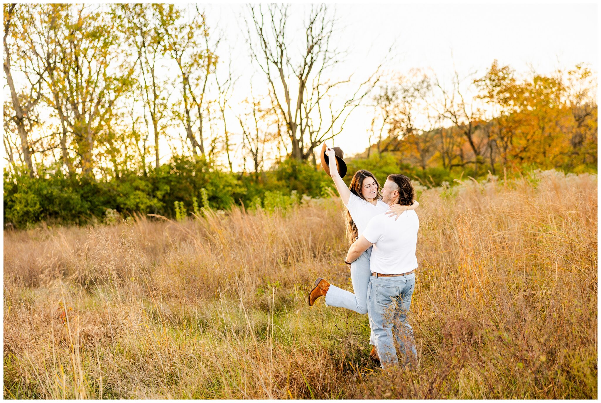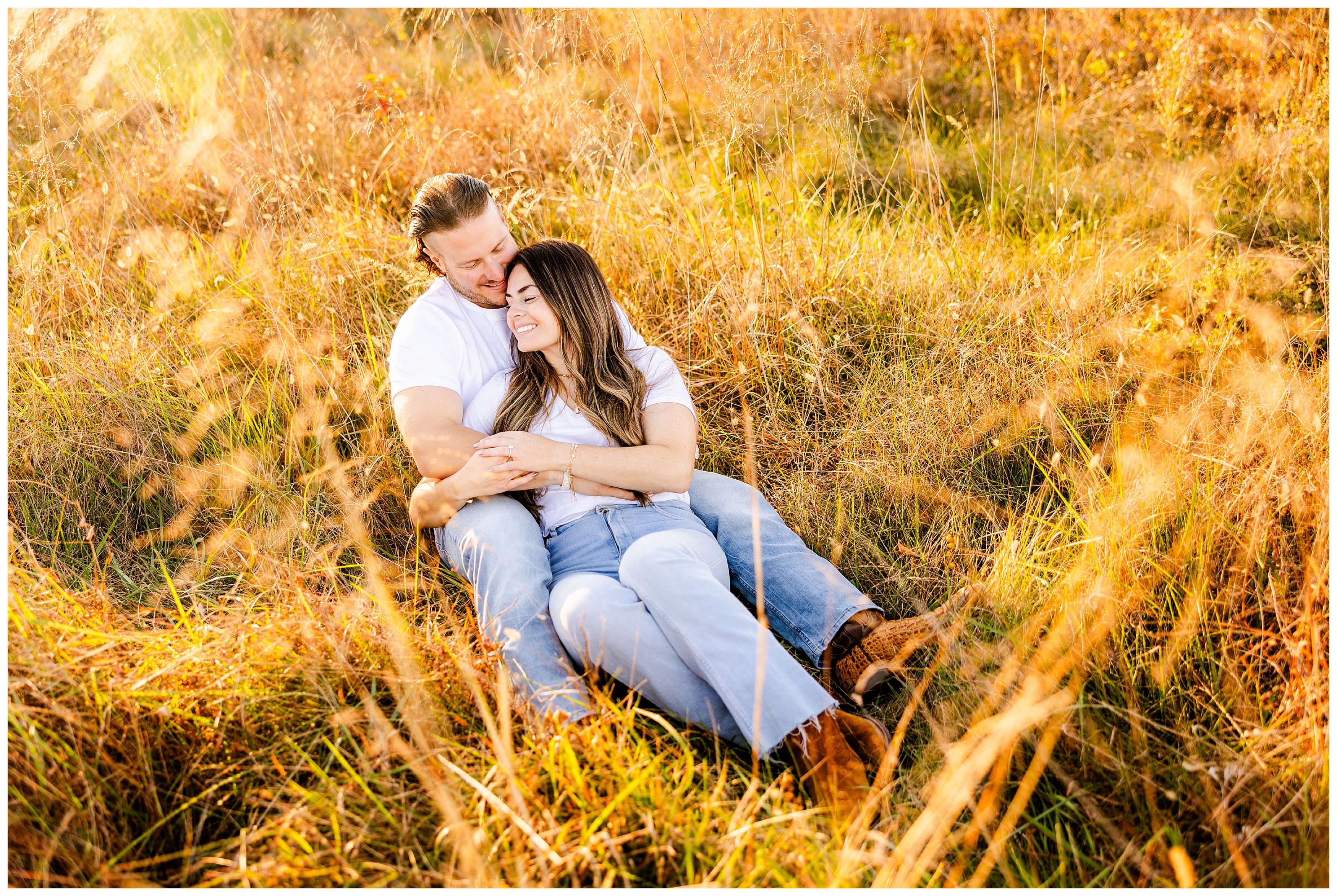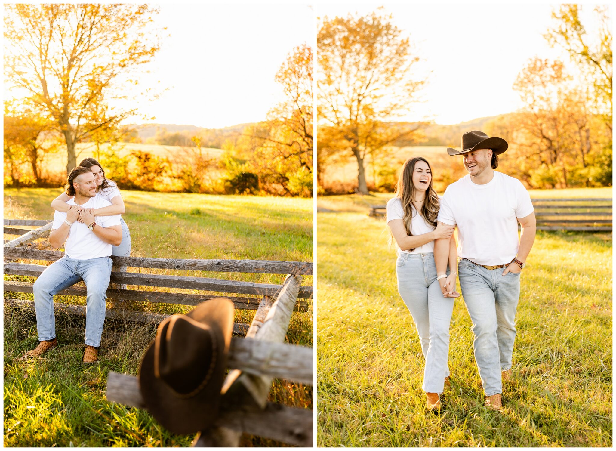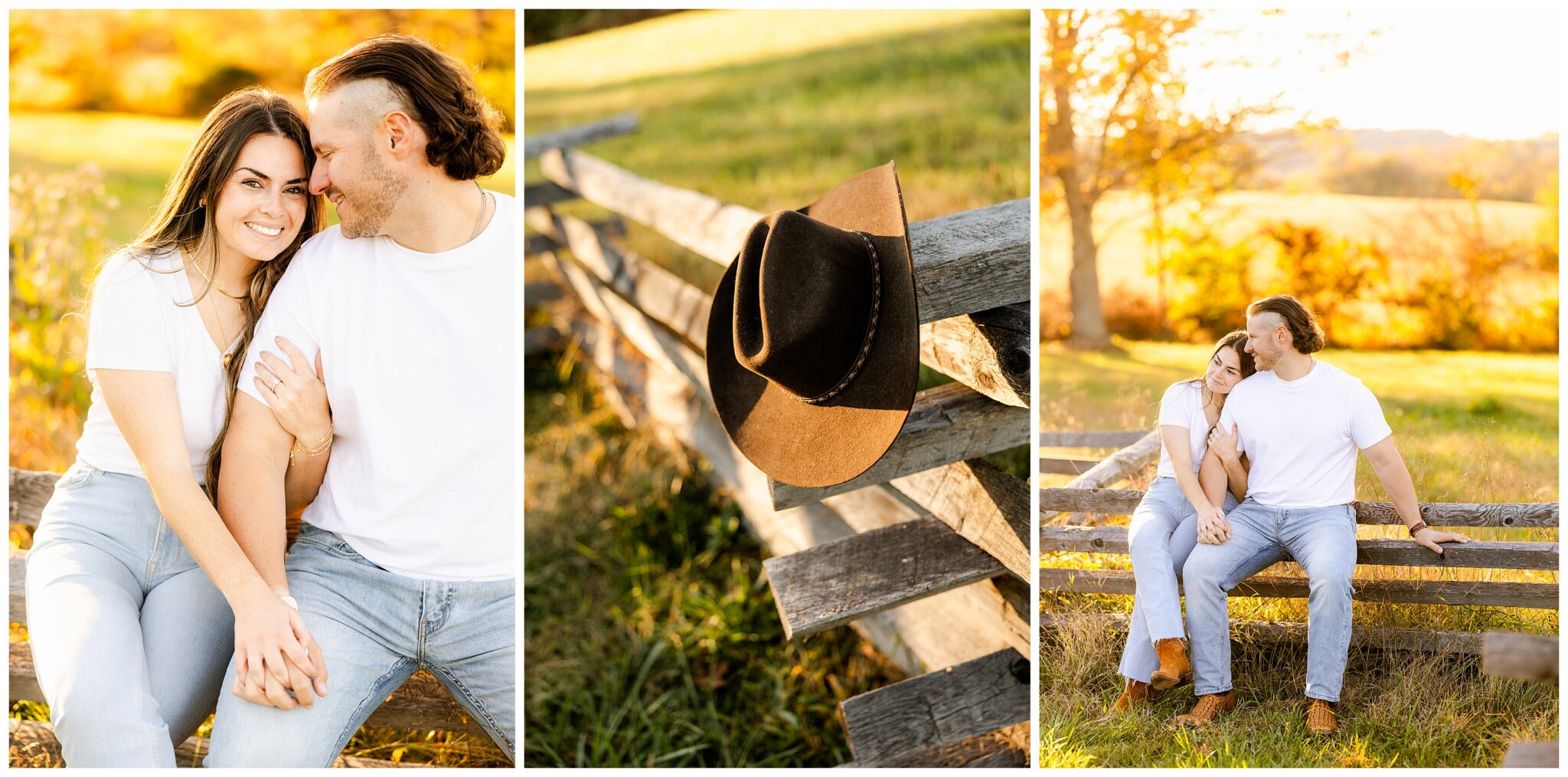 Leaning into a perfectly country vibe, Lou accessorized with his cowboy hat and they both wore boots that just felt effortlessly them. They started their session cuddling and laughing through the tall grass, completely playful and at ease with one another. They’re the kind of couple that feels genuine and down-to-earth from the moment you meet them — sweet, connected, and so clearly best friends. As golden hour deepened, we made our way to the tree Grace had fallen in love with, where the warm sunlight wrapped around them in the most romantic way.
