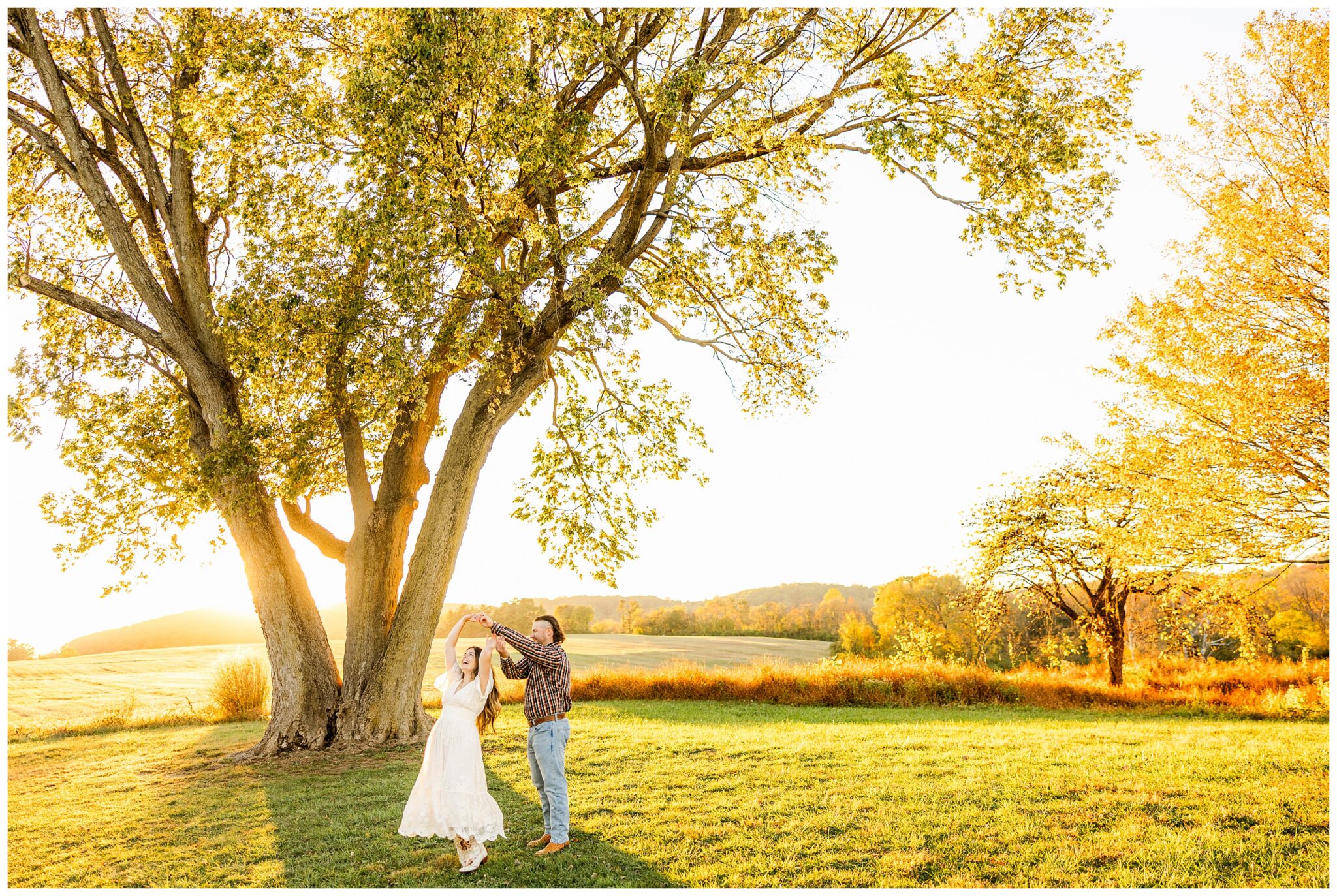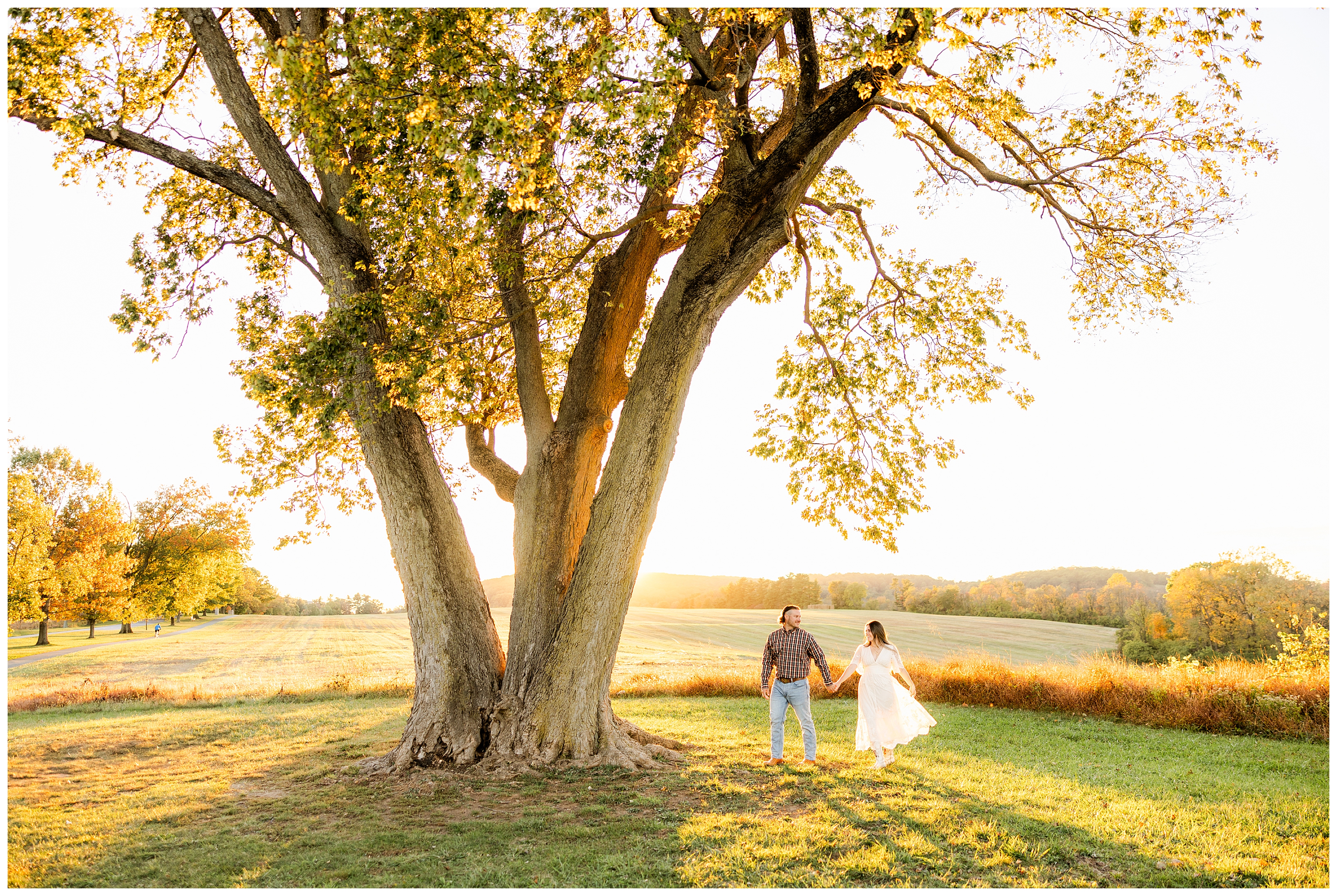 Grace and Lou’s engagement session at Valley Forge National Historical Park was the perfect blend of country charm and golden hour magic. What started as an overcast evening quickly turned into something unforgettable — the sun came out right as we began, casting the most beautiful, glowy light across the fields of tall grass. We all looked at each other in disbelief (and excitement!) as the sky transformed into the dreamiest backdrop. Grace had spotted this stunning tree on my Instagram months ago and immediately knew that was exactly where they wanted their engagement photos taken — and it could not have been more perfect.