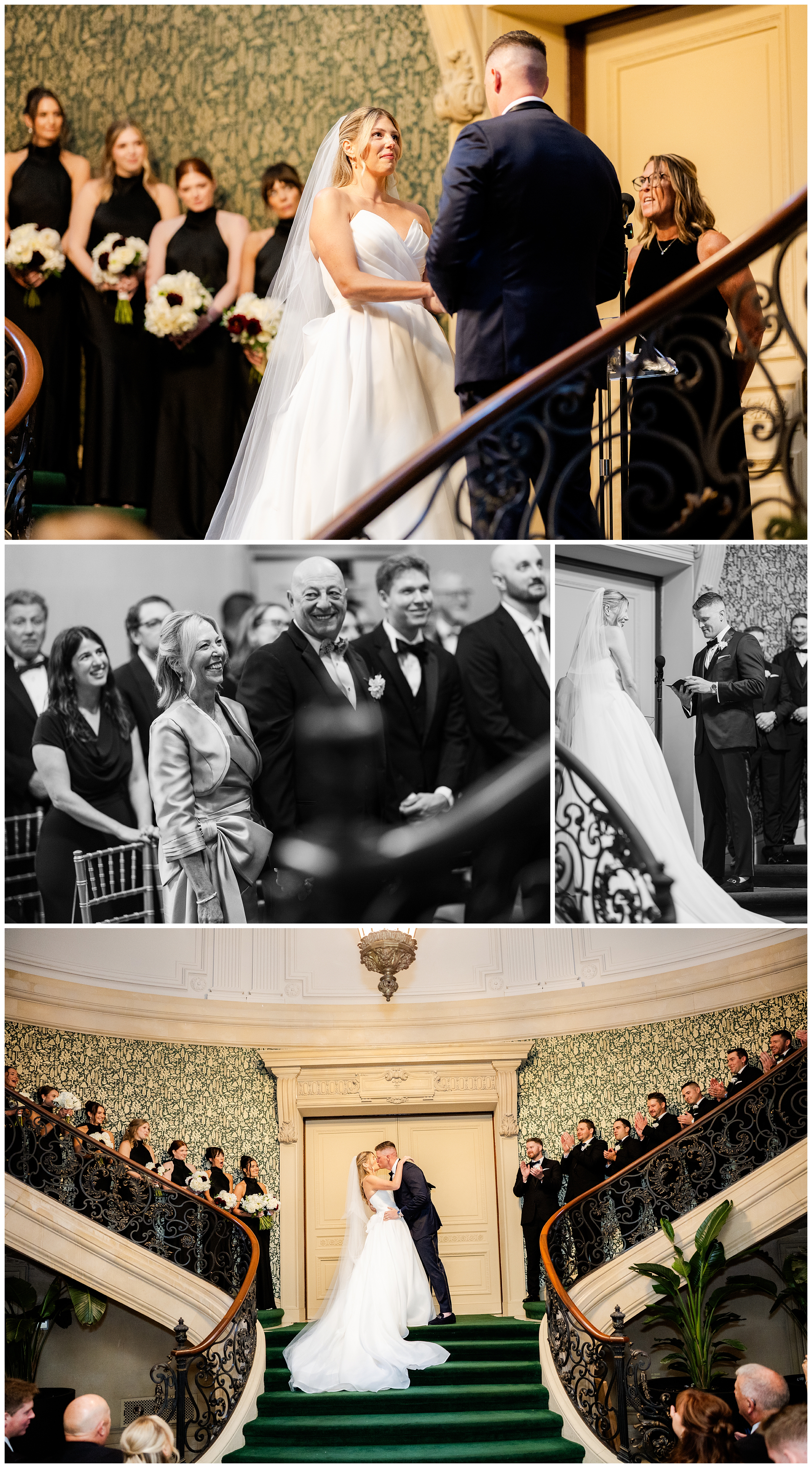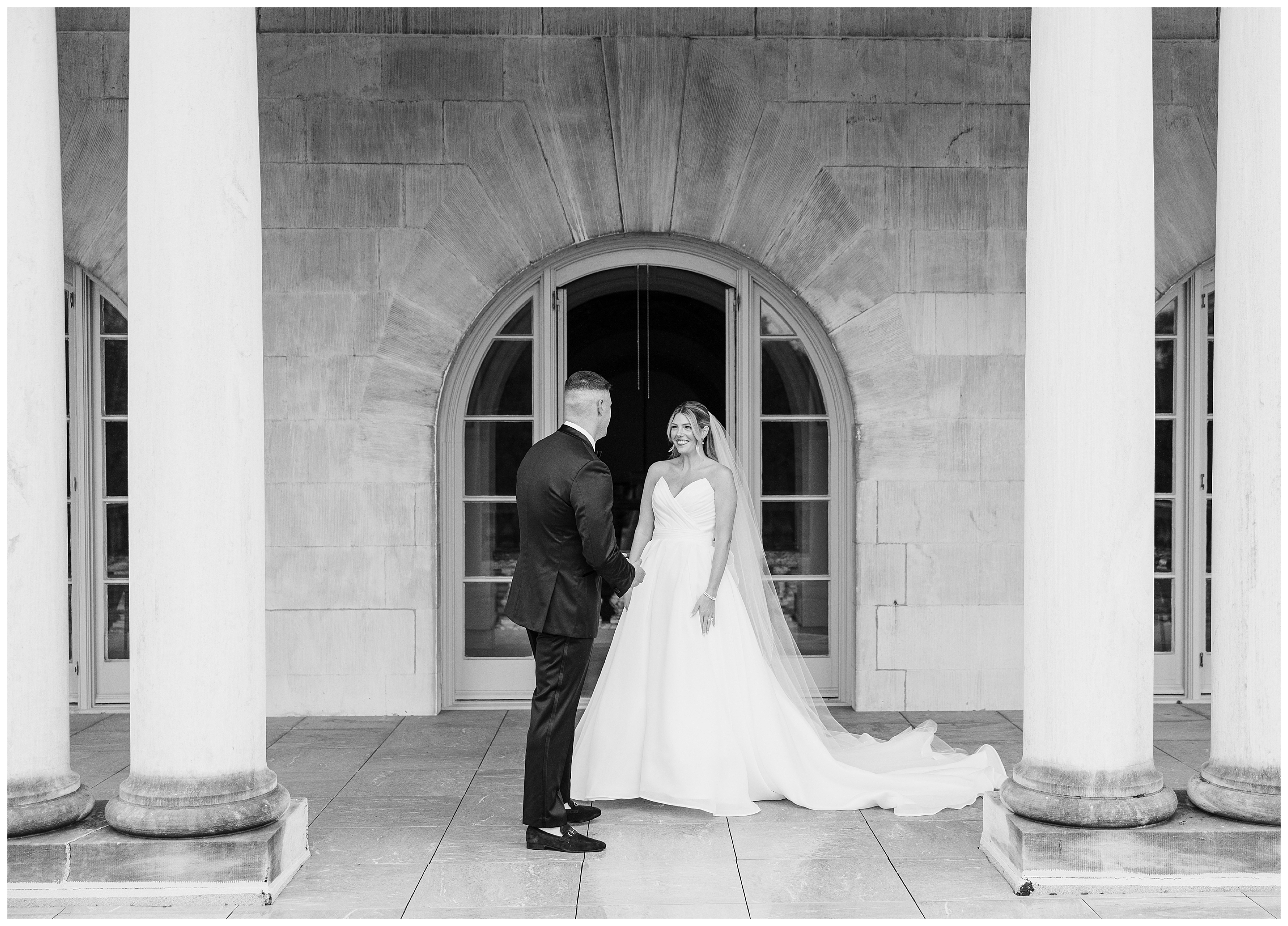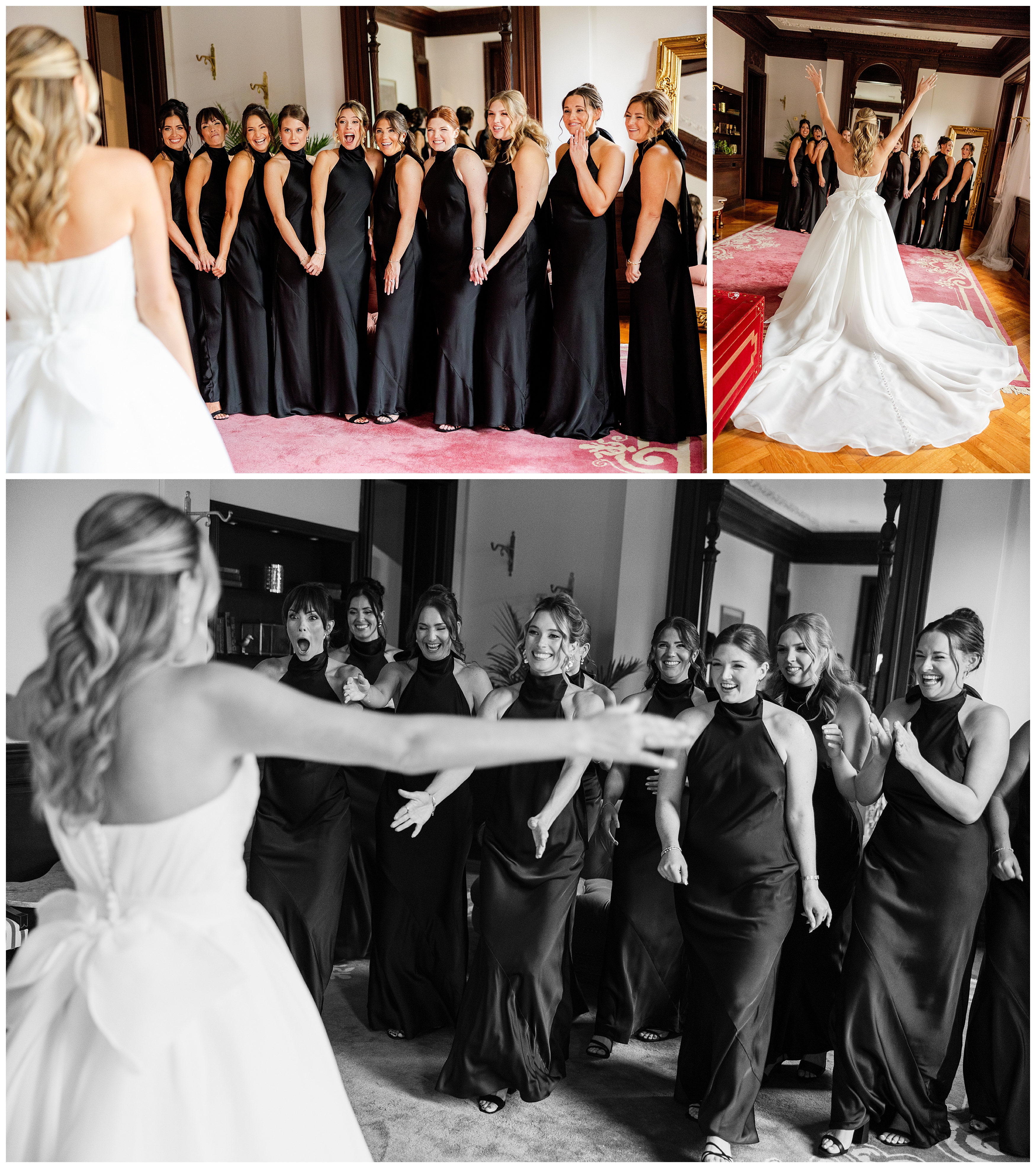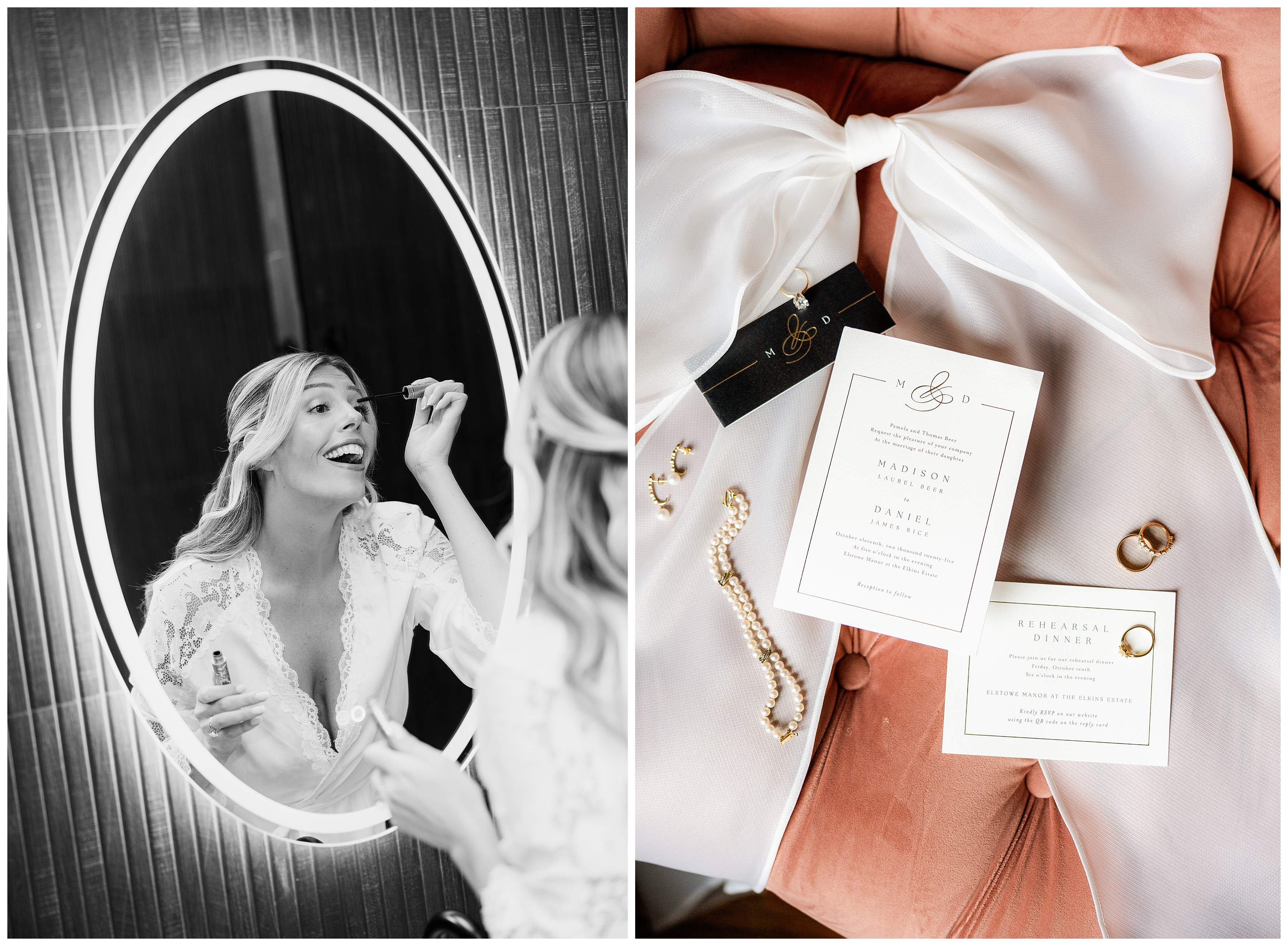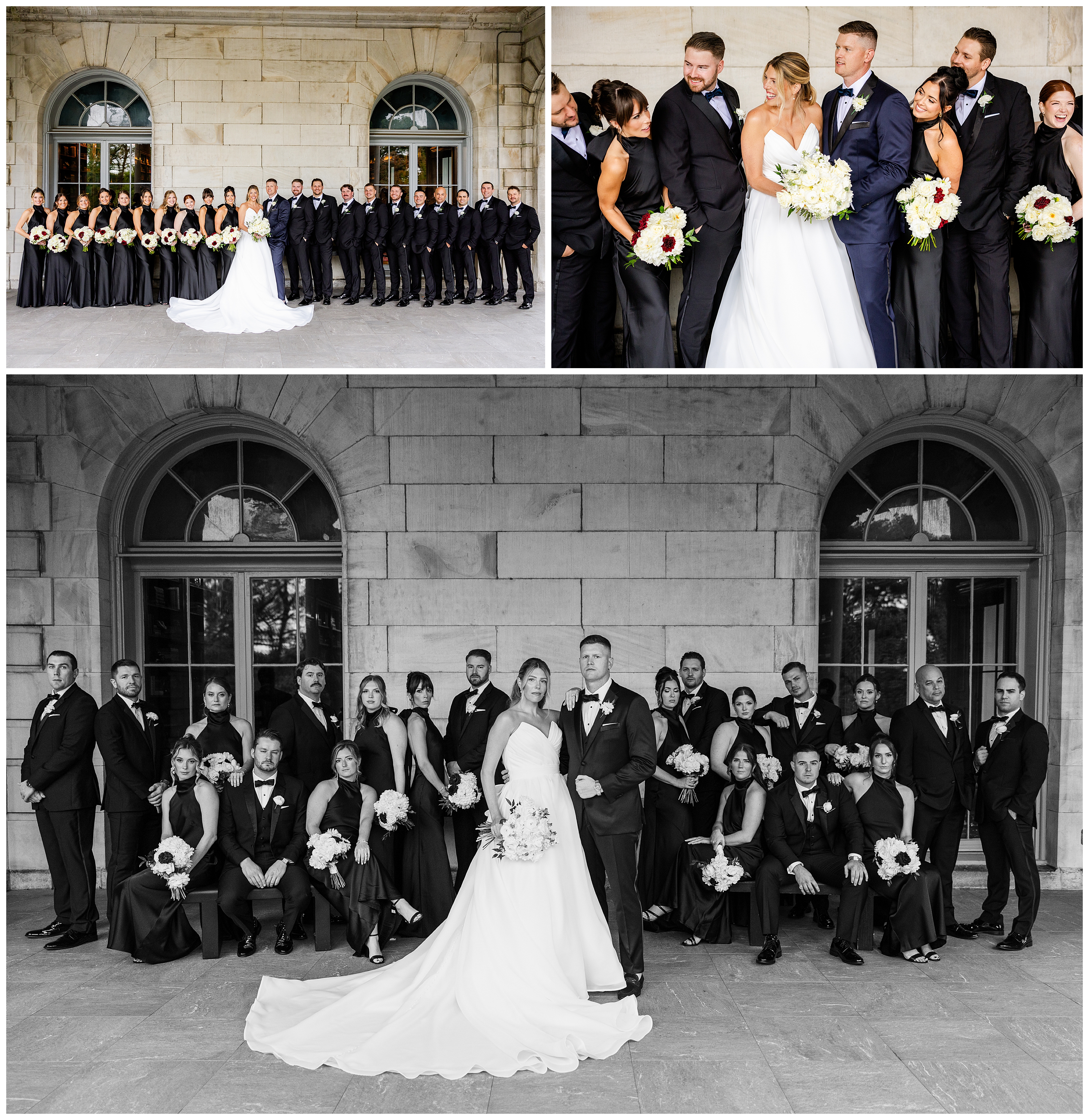 Madison and Dan’s black-tie wedding at Elkins Estate was the perfect blend of timeless elegance and joyful celebration just outside of Philadelphia. Elkins Estate offers breathtaking architecture, grand staircases, and ornate interiors that feel straight out of Europe. Madison and Dan fell in love with the history and atmosphere of the space (as did I!). The setting paired beautifully with their chic vision—classic florals, a refined black-and-white palette, and bridesmaids dressed in beautiful gowns finished with elegant black bows cascading down the back, a sweet nod to the bow featured on Madison’s gown. Every detail felt intentional, stylish, and effortlessly classic.