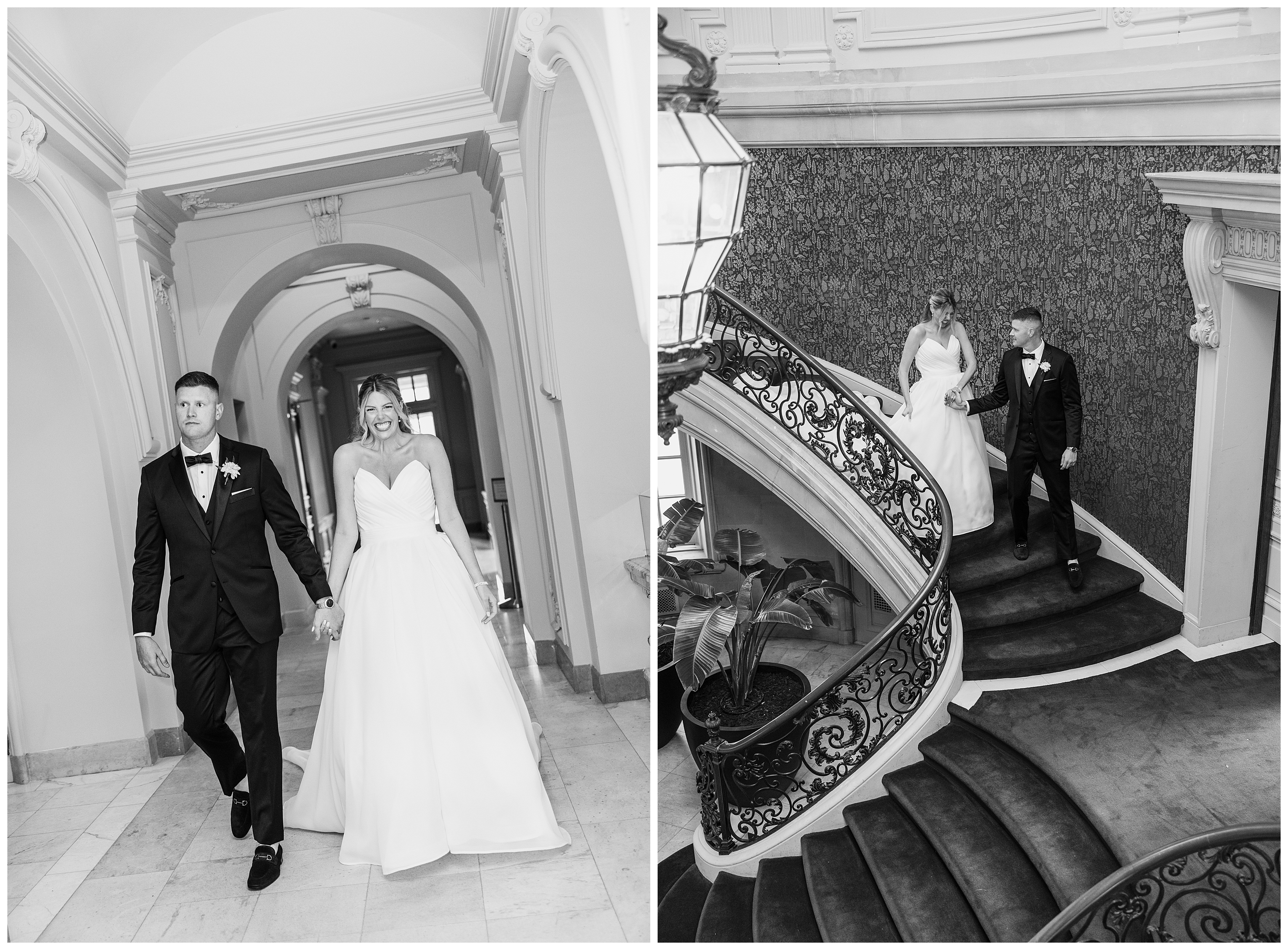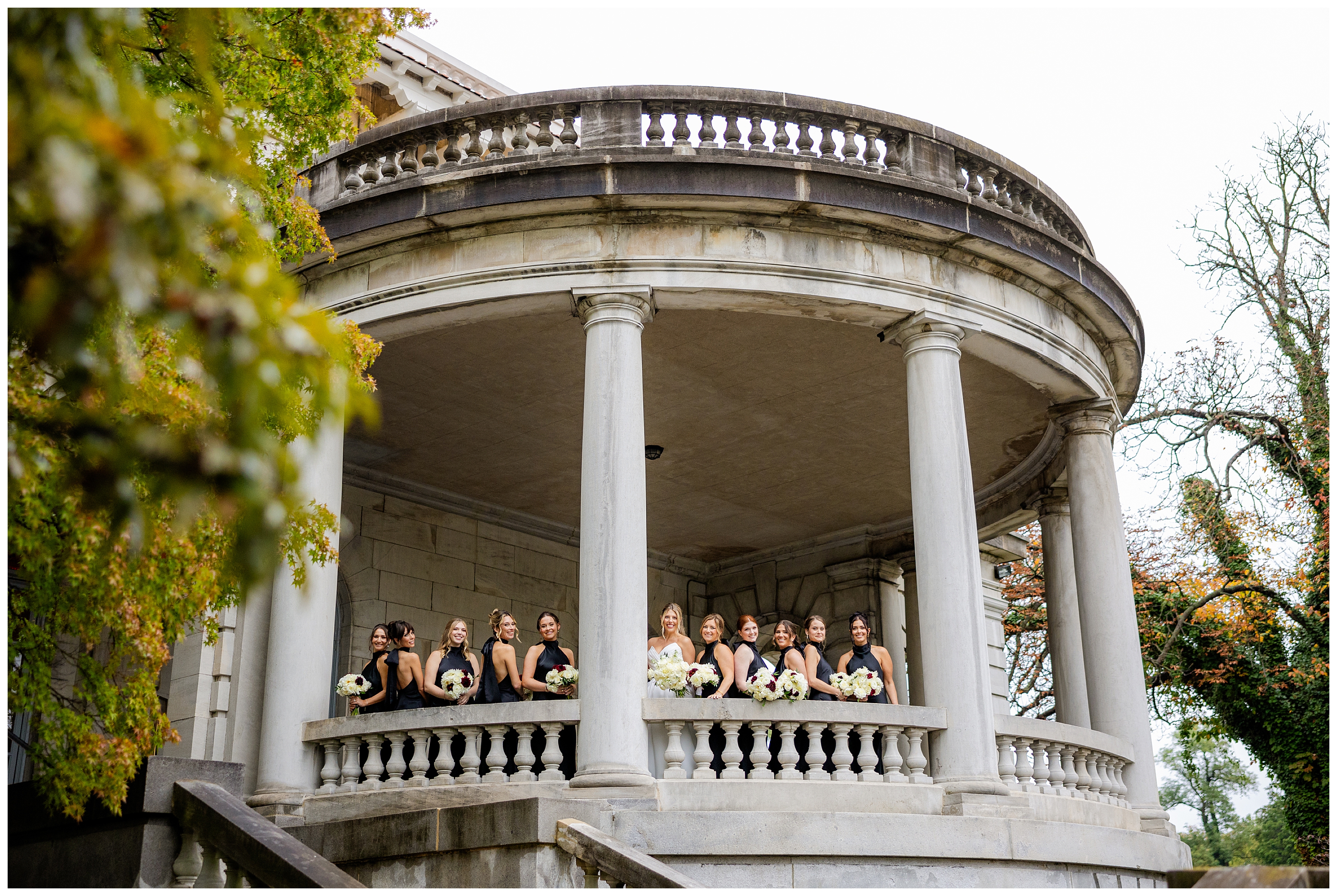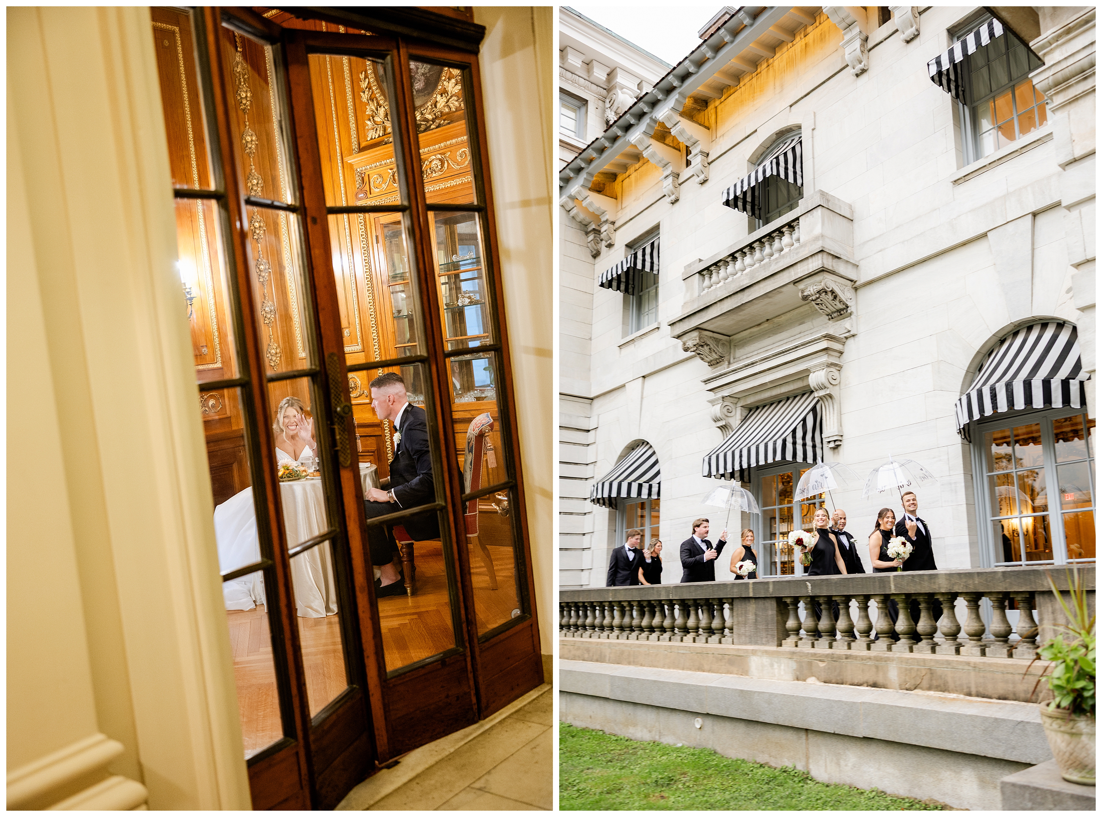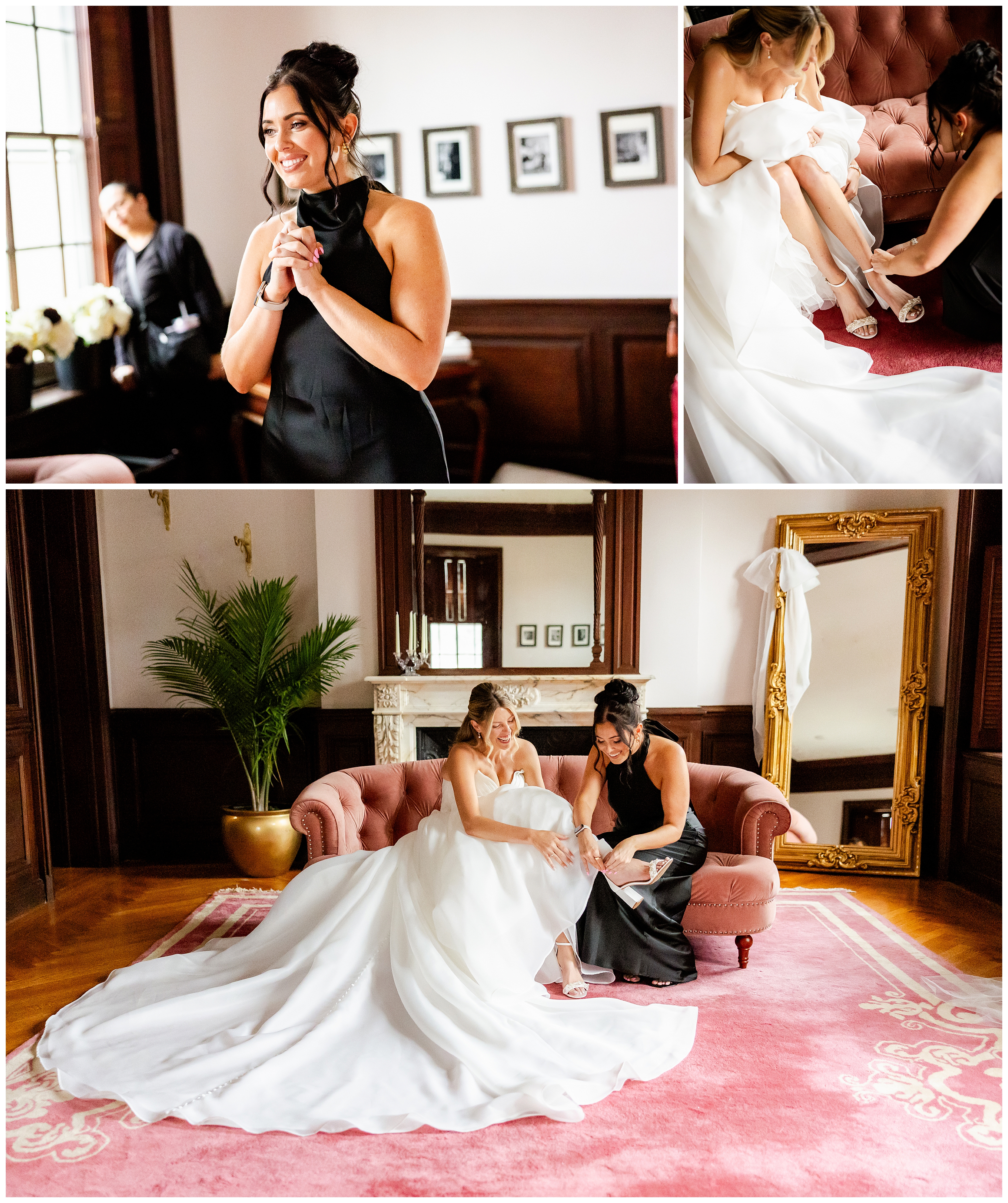 Madison and Dan’s black-tie wedding at Elkins Estate was the perfect blend of timeless elegance and joyful celebration just outside of Philadelphia. Elkins Estate offers breathtaking architecture, grand staircases, and ornate interiors that feel straight out of Europe. Madison and Dan fell in love with the history and atmosphere of the space (as did I!). The setting paired beautifully with their chic vision—classic florals, a refined black-and-white palette, and bridesmaids dressed in beautiful gowns finished with elegant black bows cascading down the back, a sweet nod to the bow featured on Madison’s gown. Every detail felt intentional, stylish, and effortlessly classic.