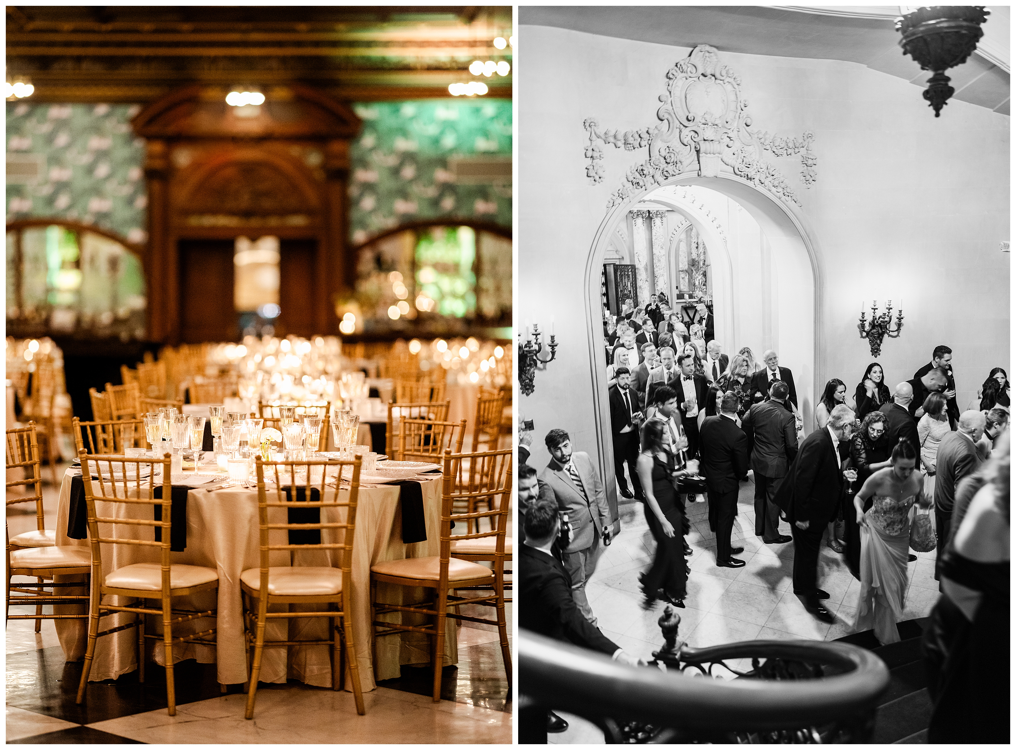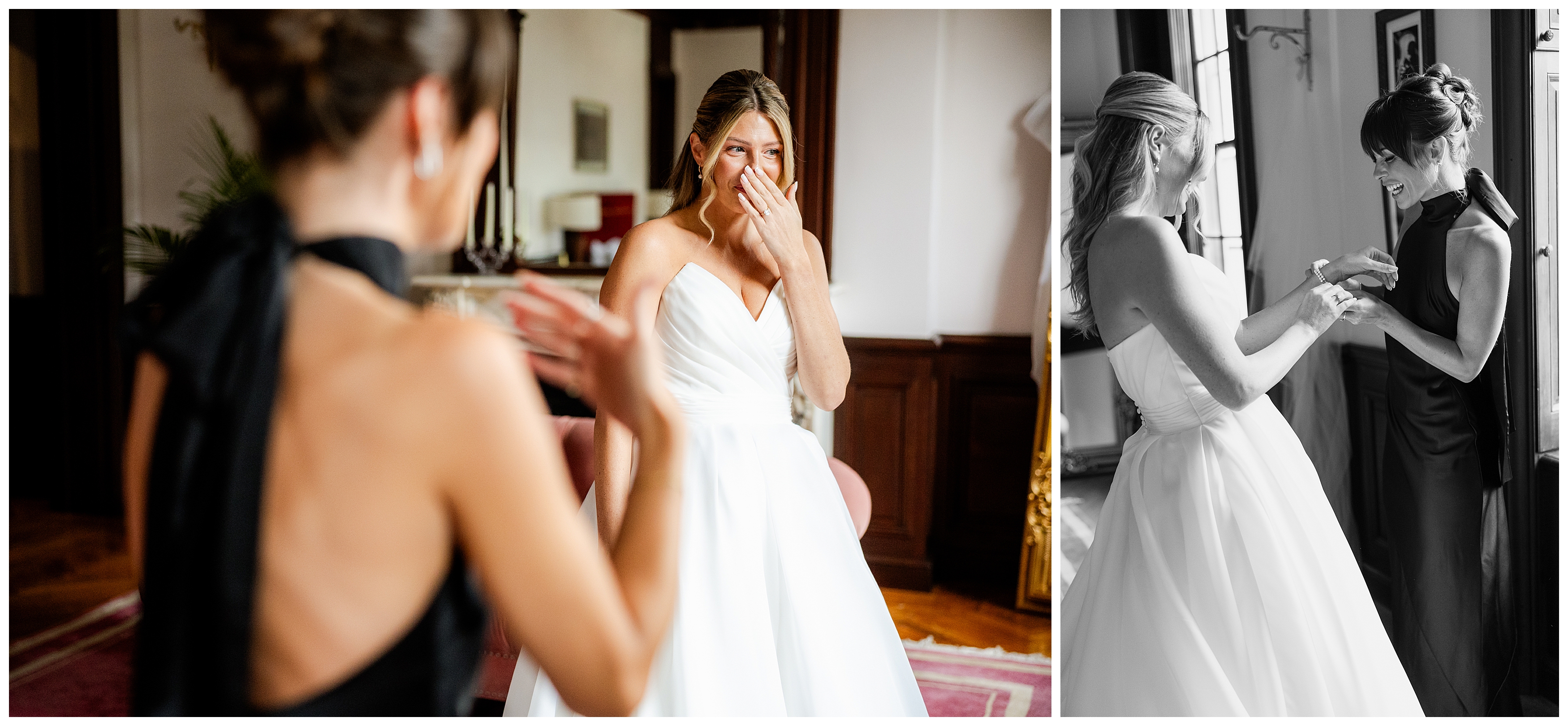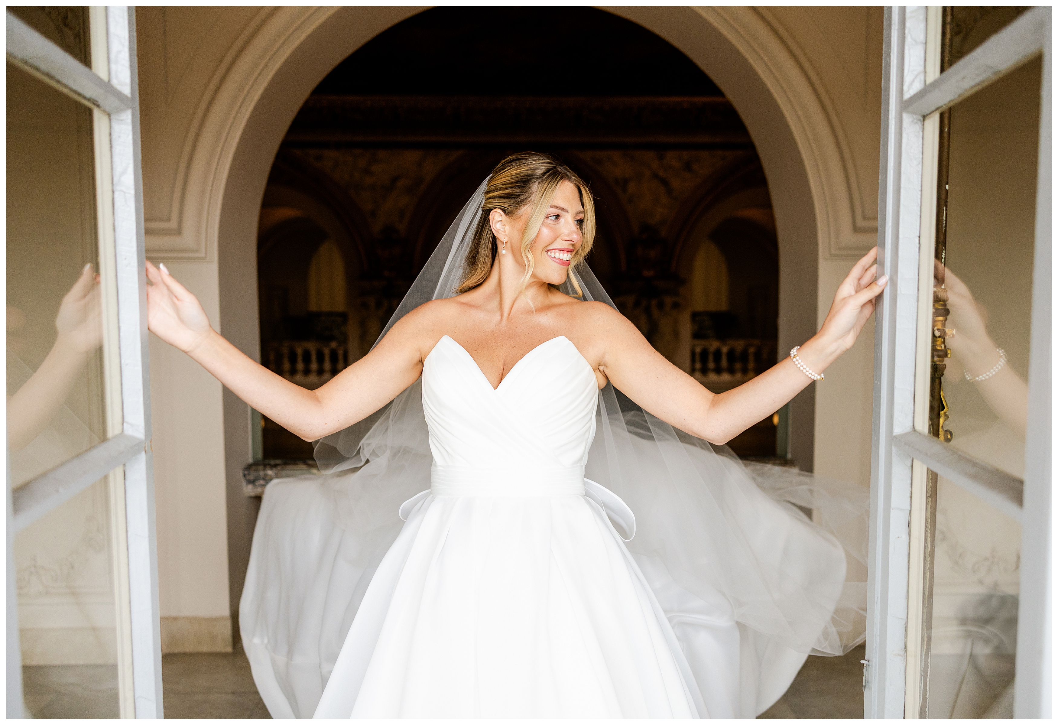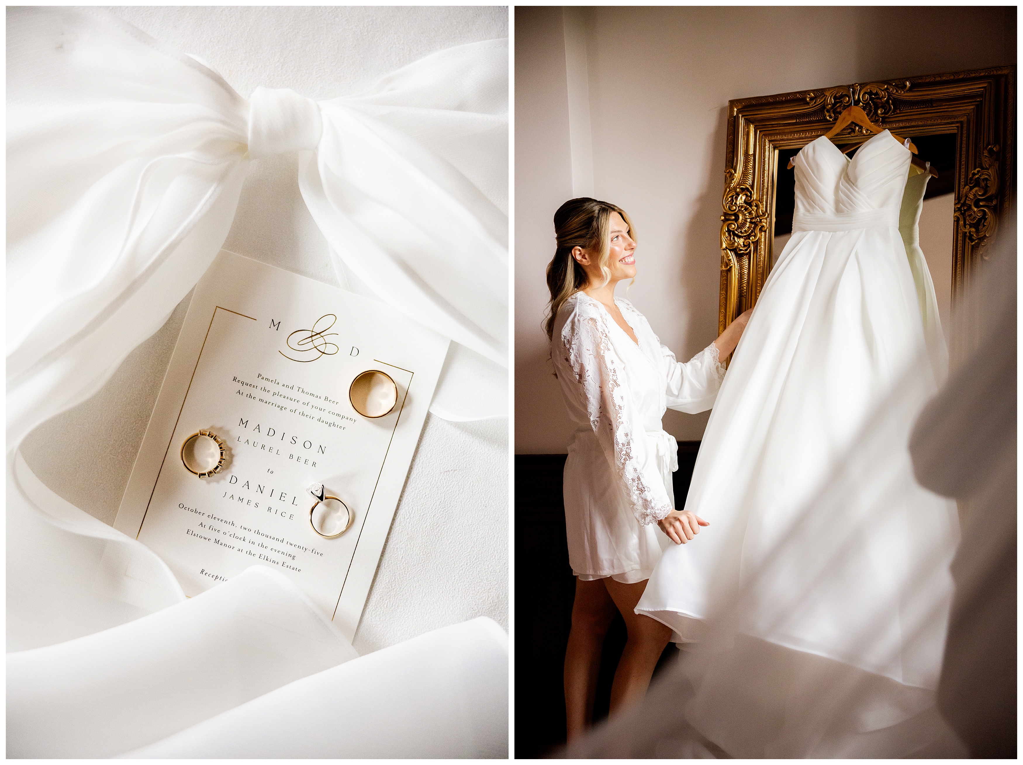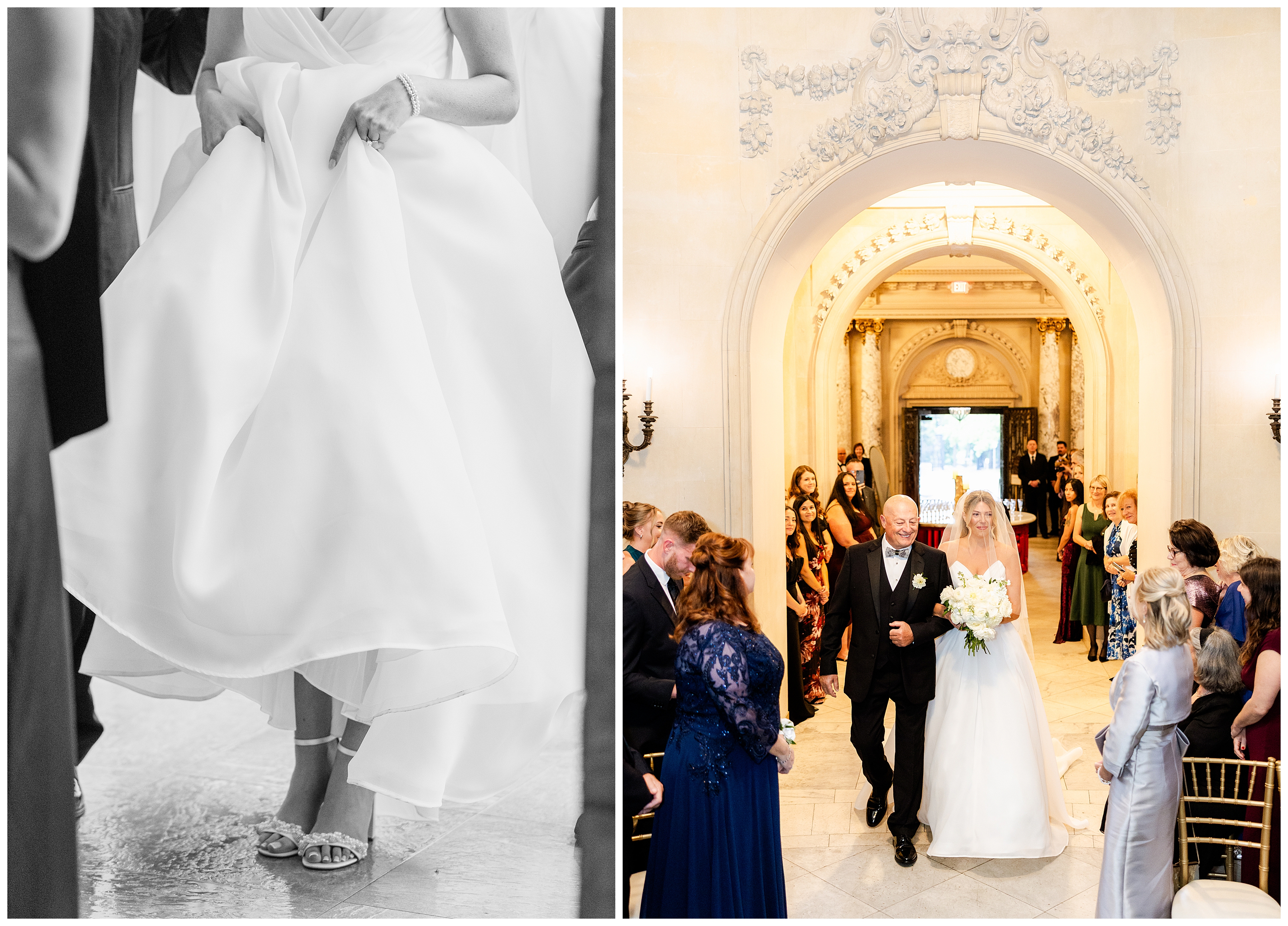 Madison and Dan’s black-tie wedding at Elkins Estate was the perfect blend of timeless elegance and joyful celebration just outside of Philadelphia. Elkins Estate offers breathtaking architecture, grand staircases, and ornate interiors that feel straight out of Europe. Madison and Dan fell in love with the history and atmosphere of the space (as did I!). The setting paired beautifully with their chic vision—classic florals, a refined black-and-white palette, and bridesmaids dressed in beautiful gowns finished with elegant black bows cascading down the back, a sweet nod to the bow featured on Madison’s gown. Every detail felt intentional, stylish, and effortlessly classic.