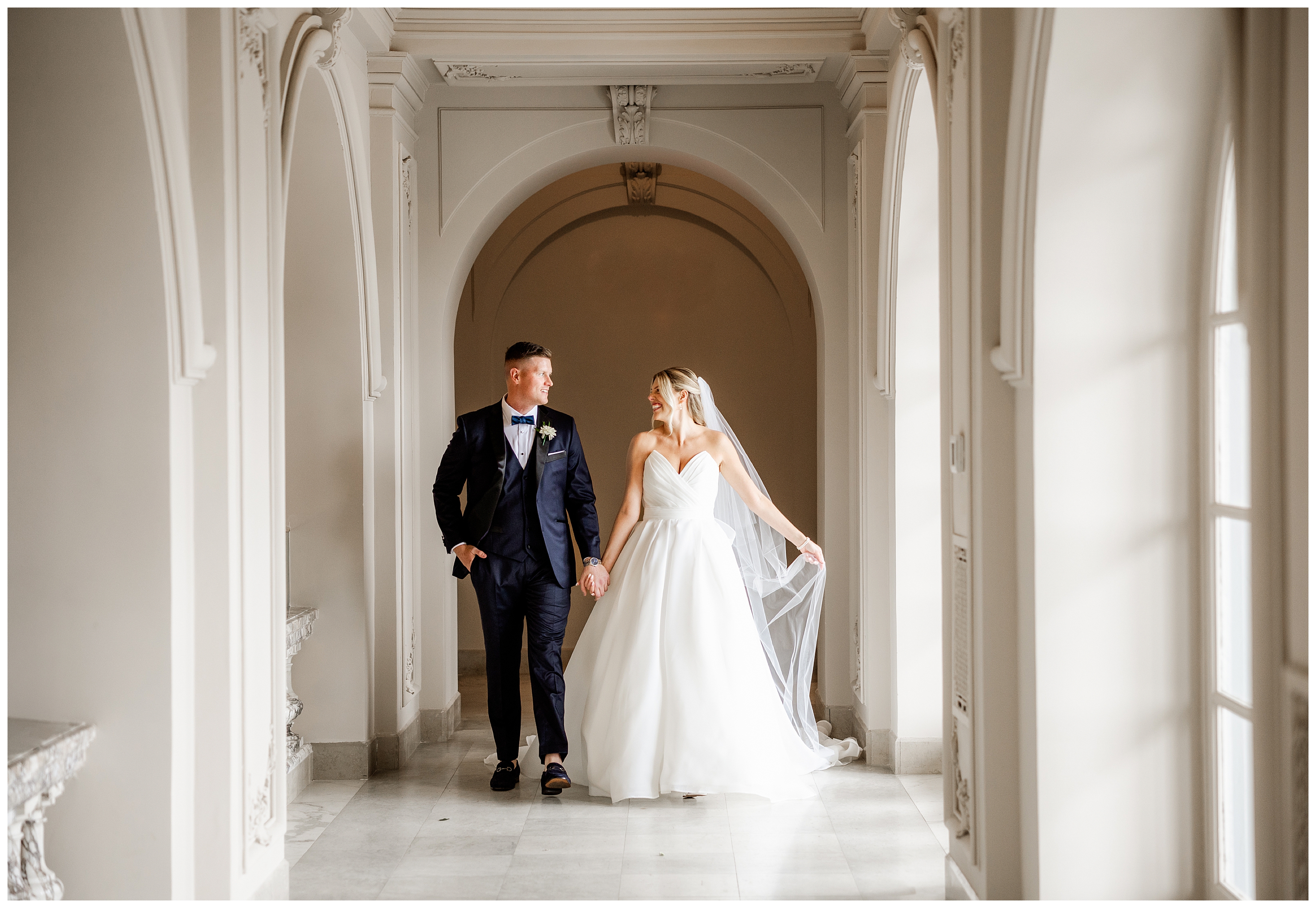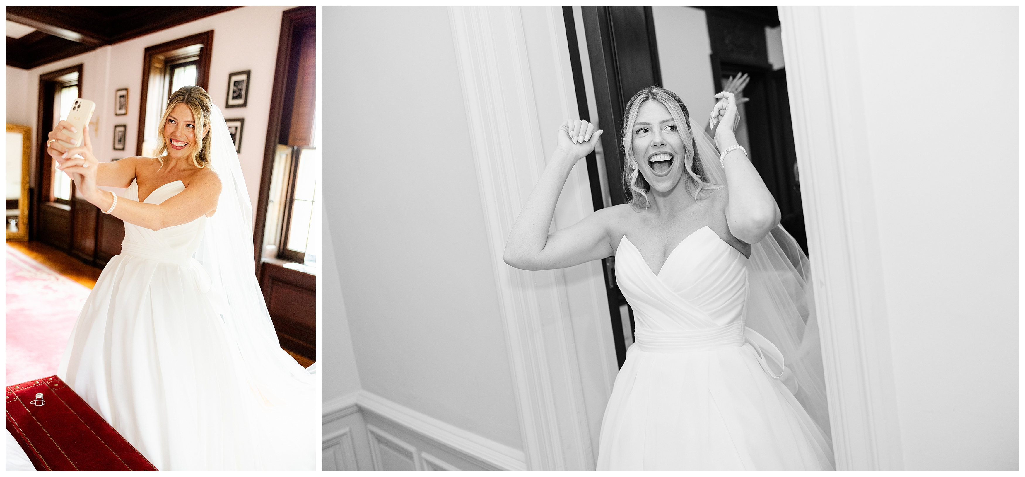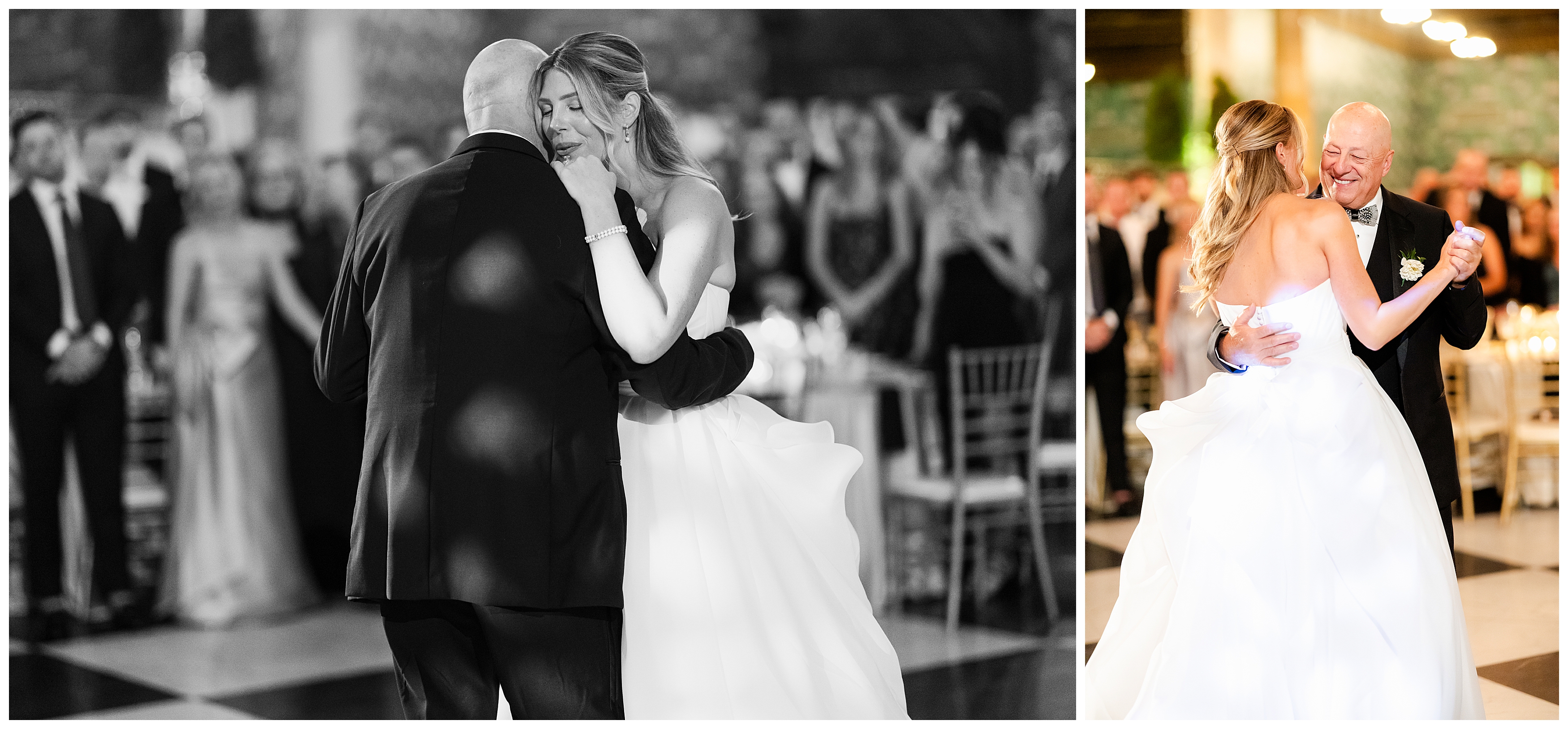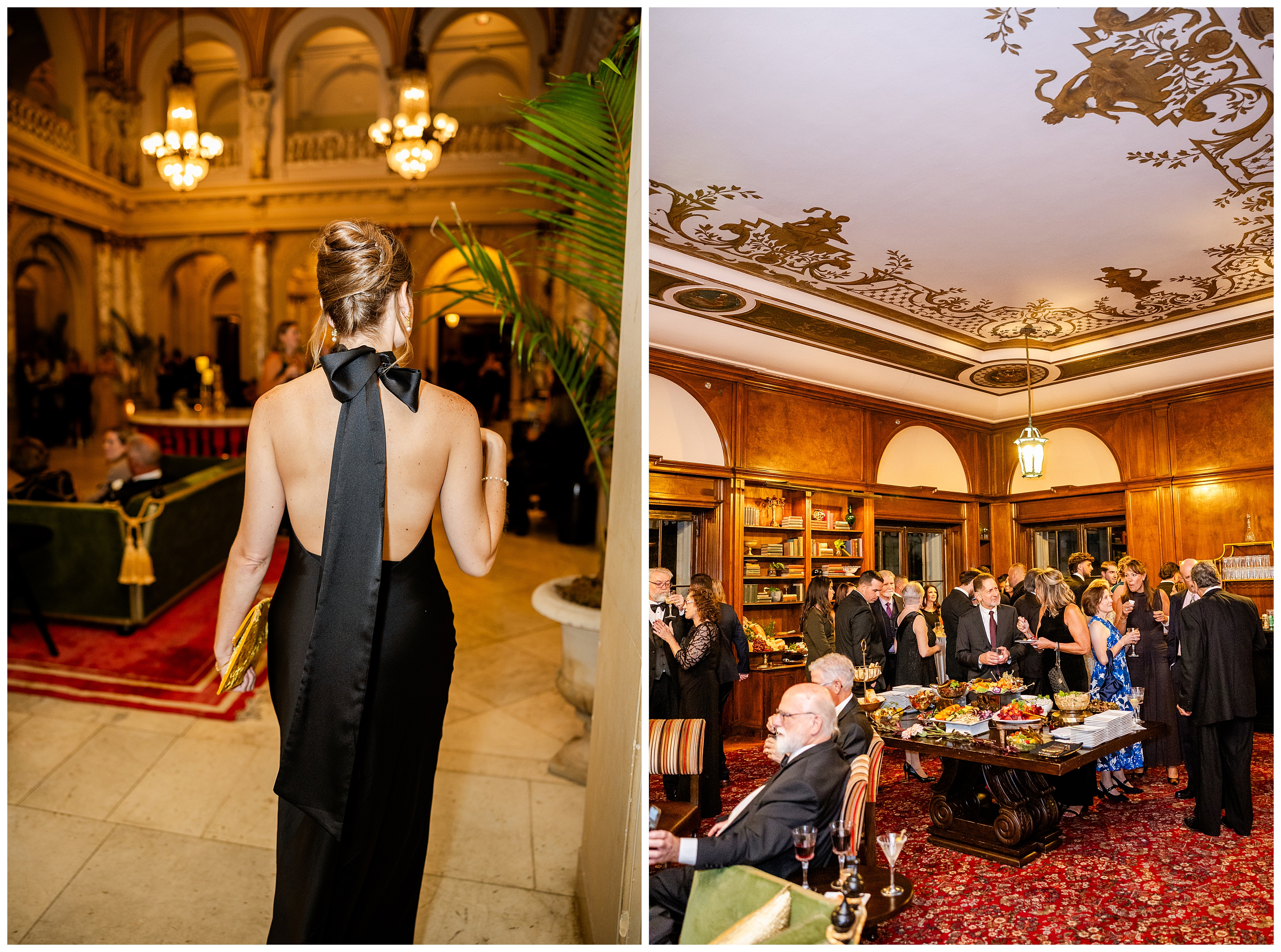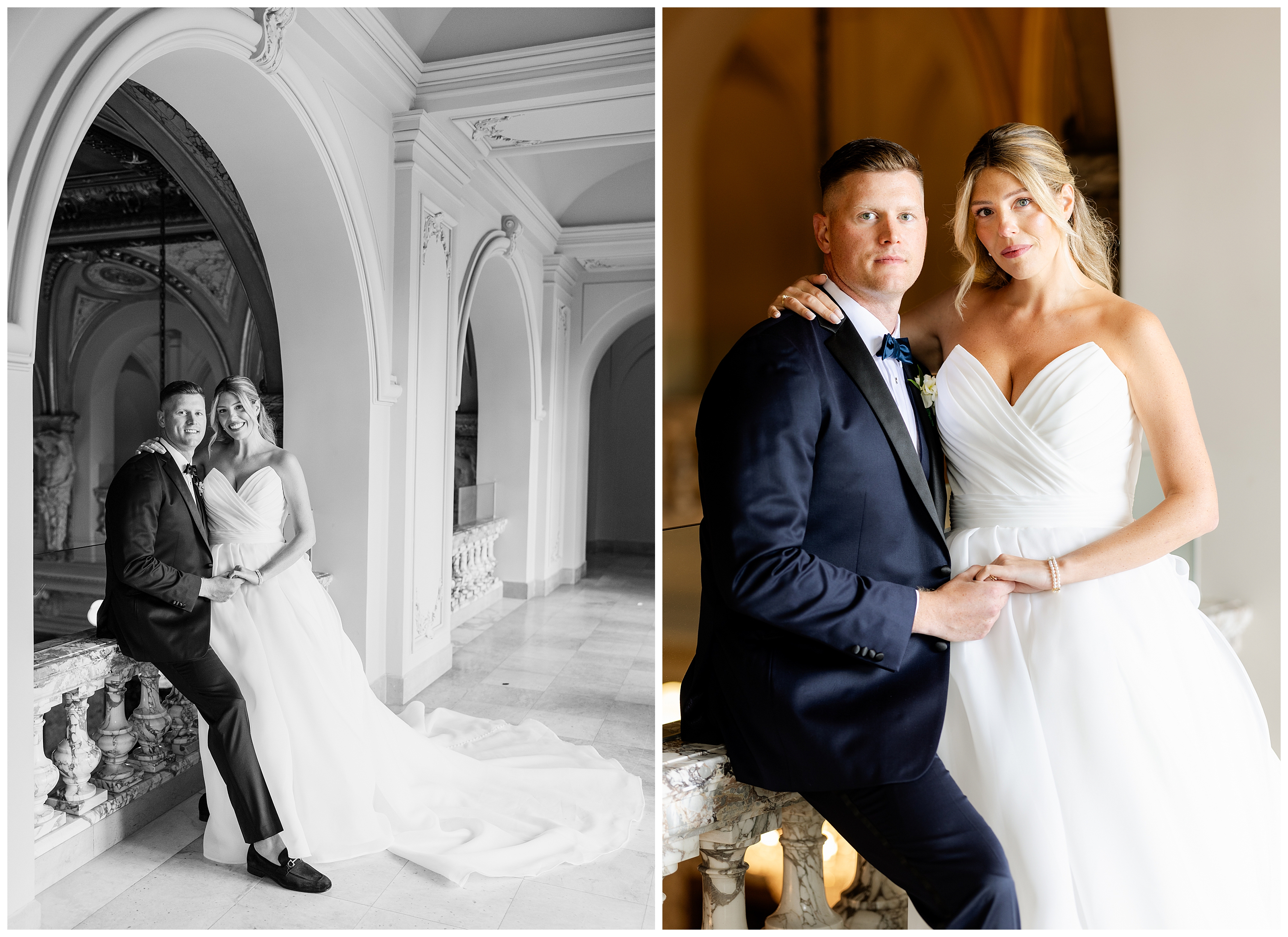 Madison and Dan’s black-tie wedding at Elkins Estate was the perfect blend of timeless elegance and joyful celebration just outside of Philadelphia. Elkins Estate offers breathtaking architecture, grand staircases, and ornate interiors that feel straight out of Europe. Madison and Dan fell in love with the history and atmosphere of the space (as did I!). The setting paired beautifully with their chic vision—classic florals, a refined black-and-white palette, and bridesmaids dressed in beautiful gowns finished with elegant black bows cascading down the back, a sweet nod to the bow featured on Madison’s gown. Every detail felt intentional, stylish, and effortlessly classic.