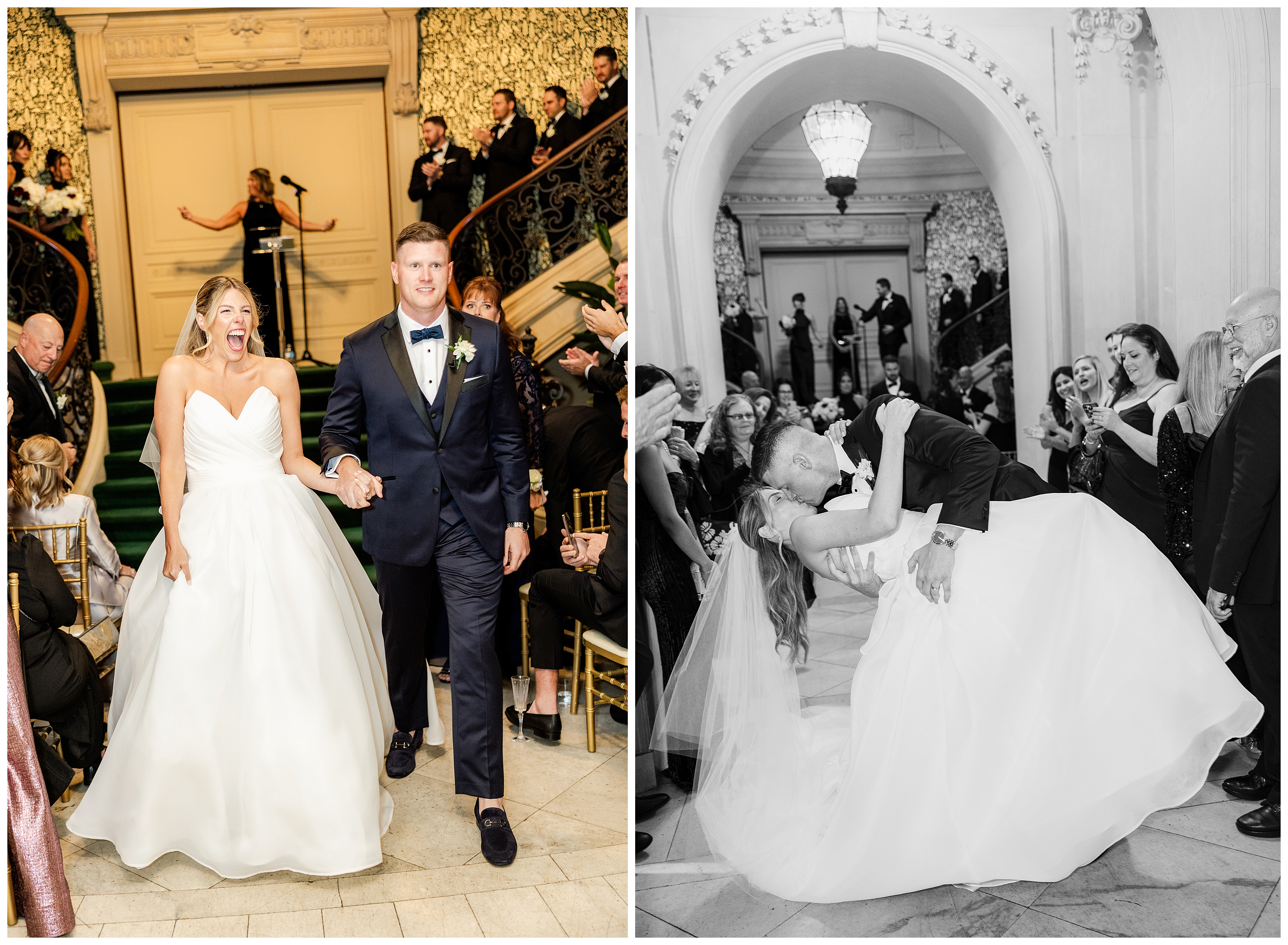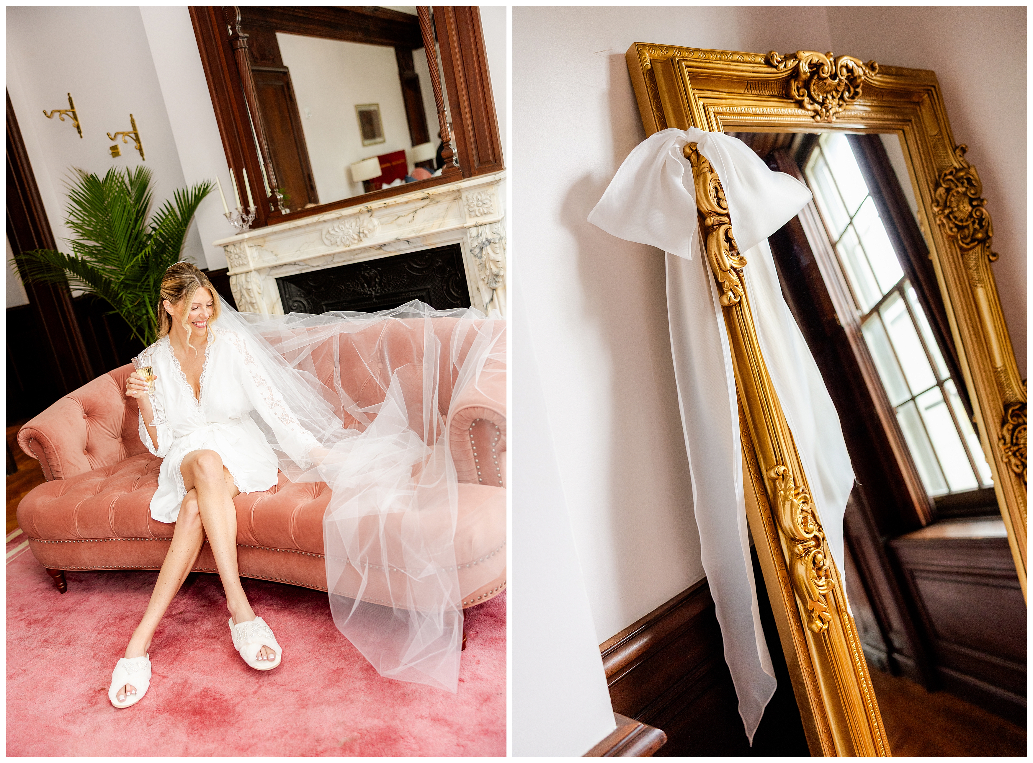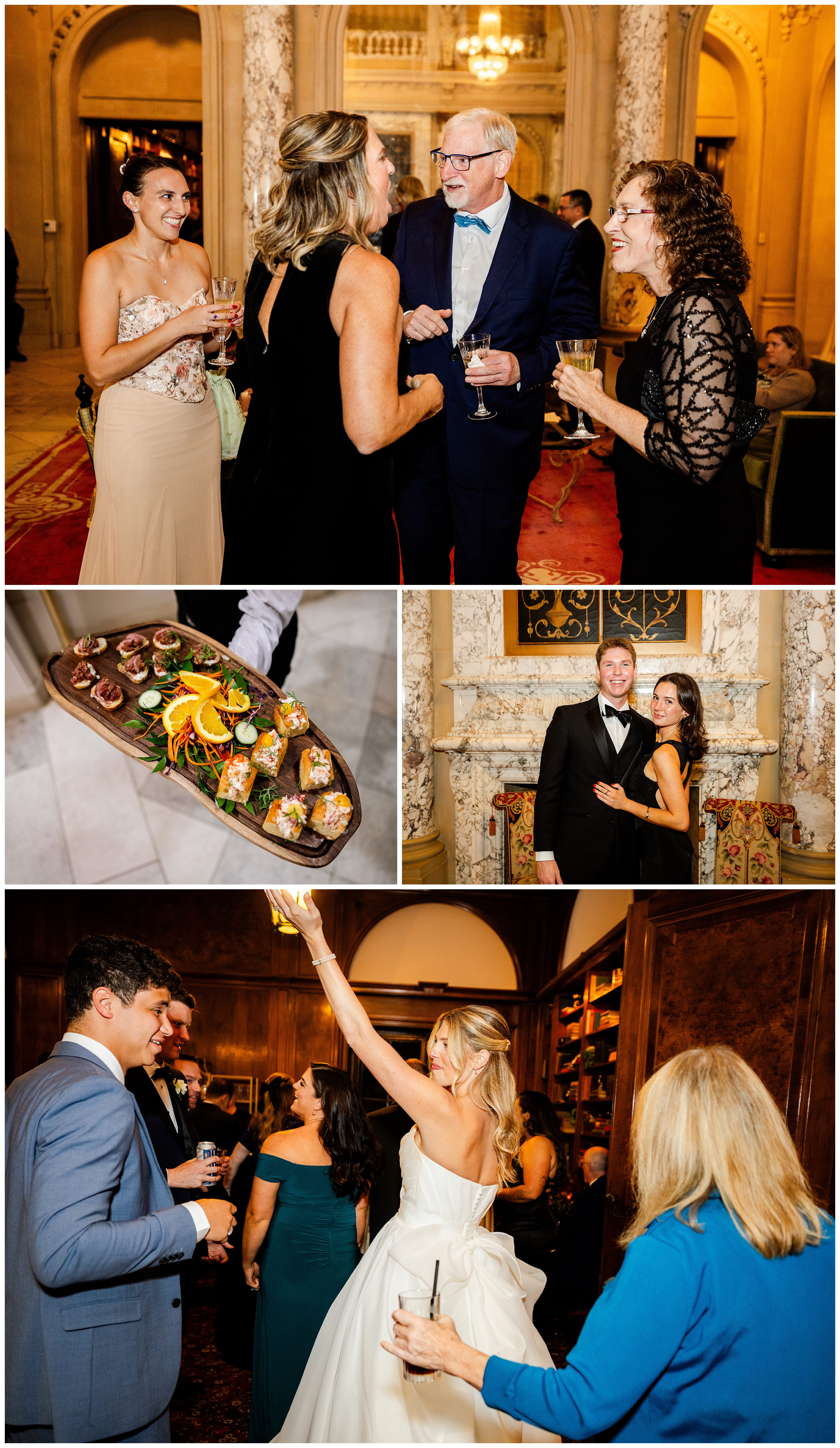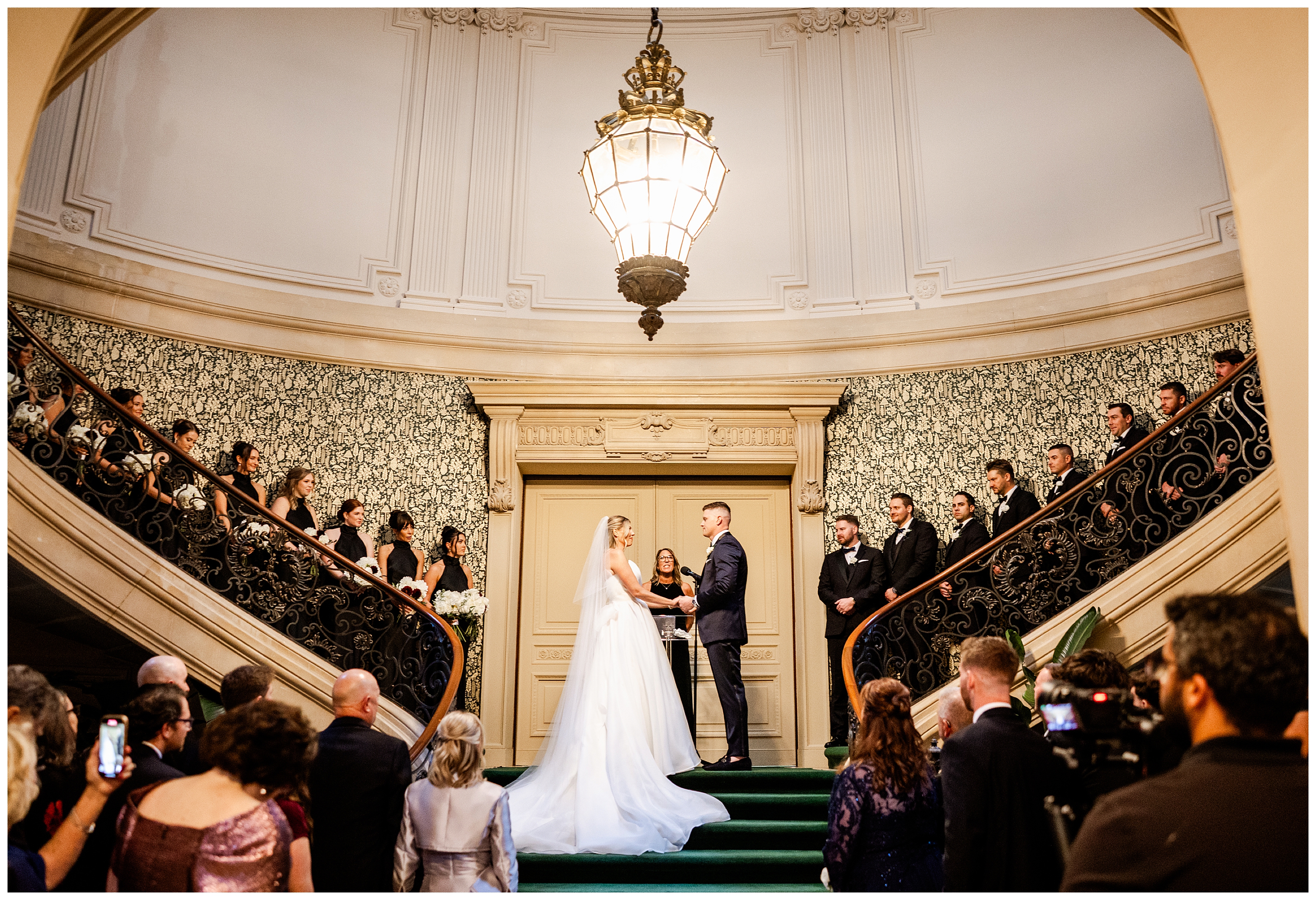 Madison and Dan’s black-tie wedding at Elkins Estate was the perfect blend of timeless elegance and joyful celebration just outside of Philadelphia. Elkins Estate offers breathtaking architecture, grand staircases, and ornate interiors that feel straight out of Europe. Madison and Dan fell in love with the history and atmosphere of the space (as did I!). The setting paired beautifully with their chic vision—classic florals, a refined black-and-white palette, and bridesmaids dressed in beautiful gowns finished with elegant black bows cascading down the back, a sweet nod to the bow featured on Madison’s gown. Every detail felt intentional, stylish, and effortlessly classic.