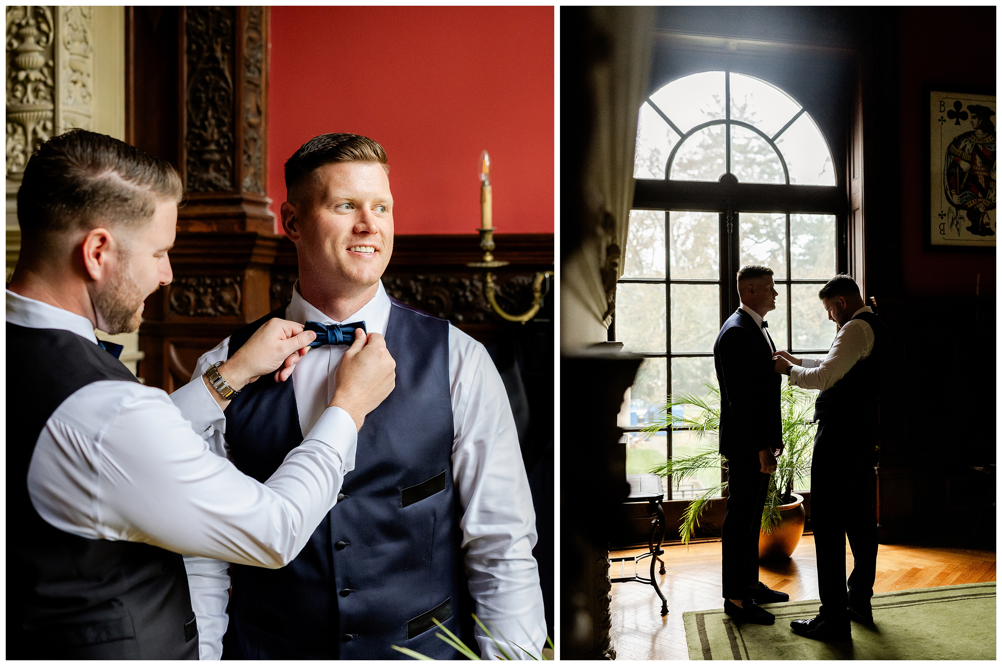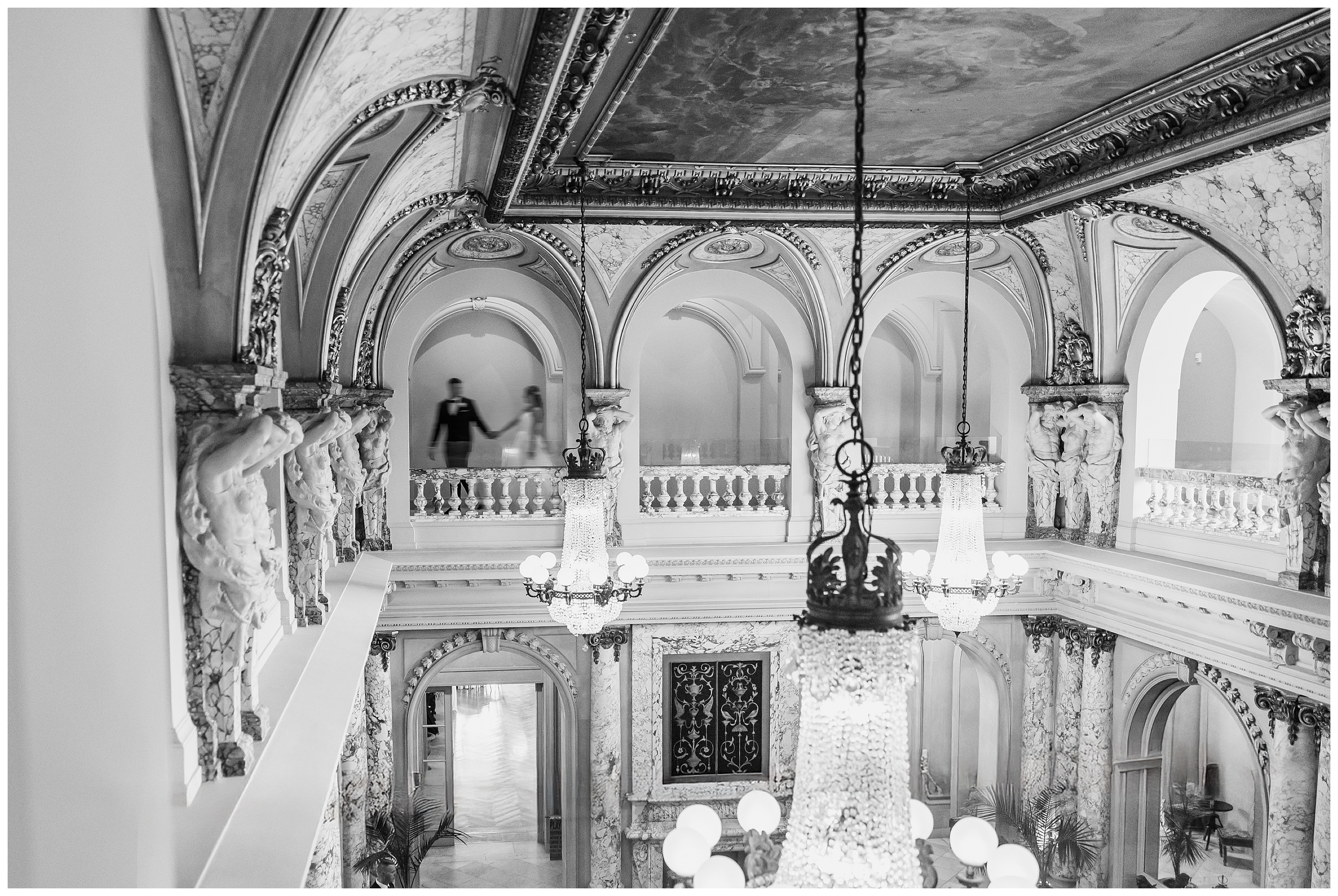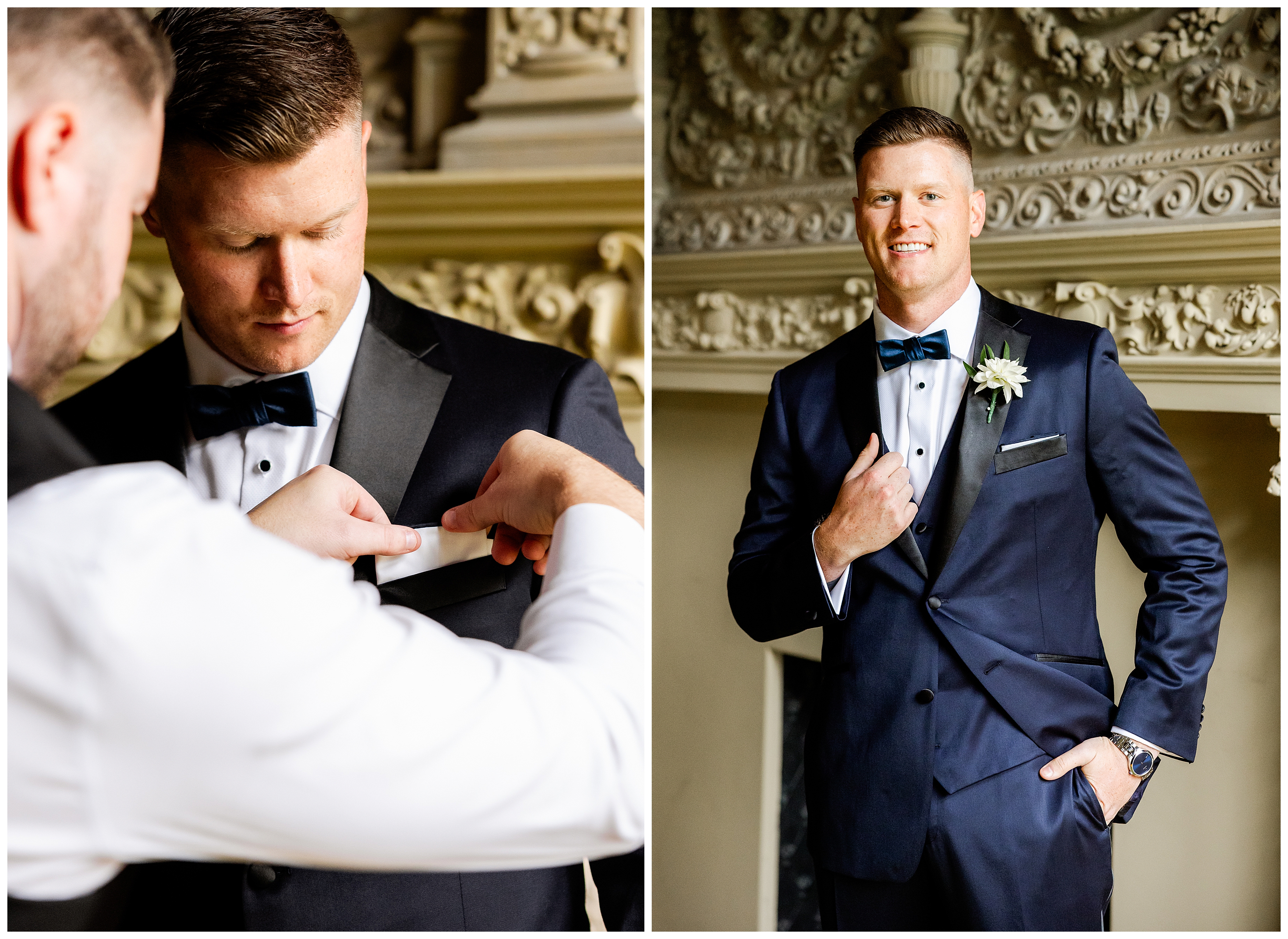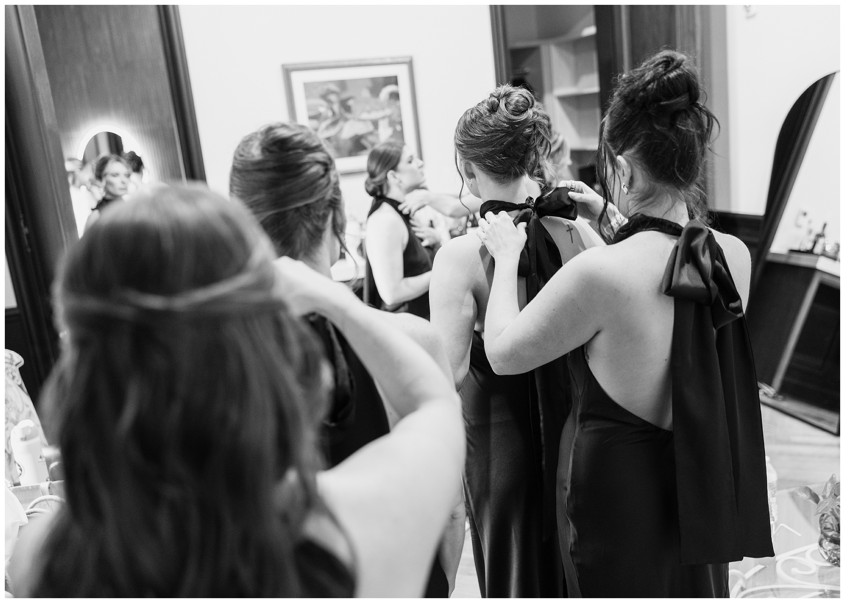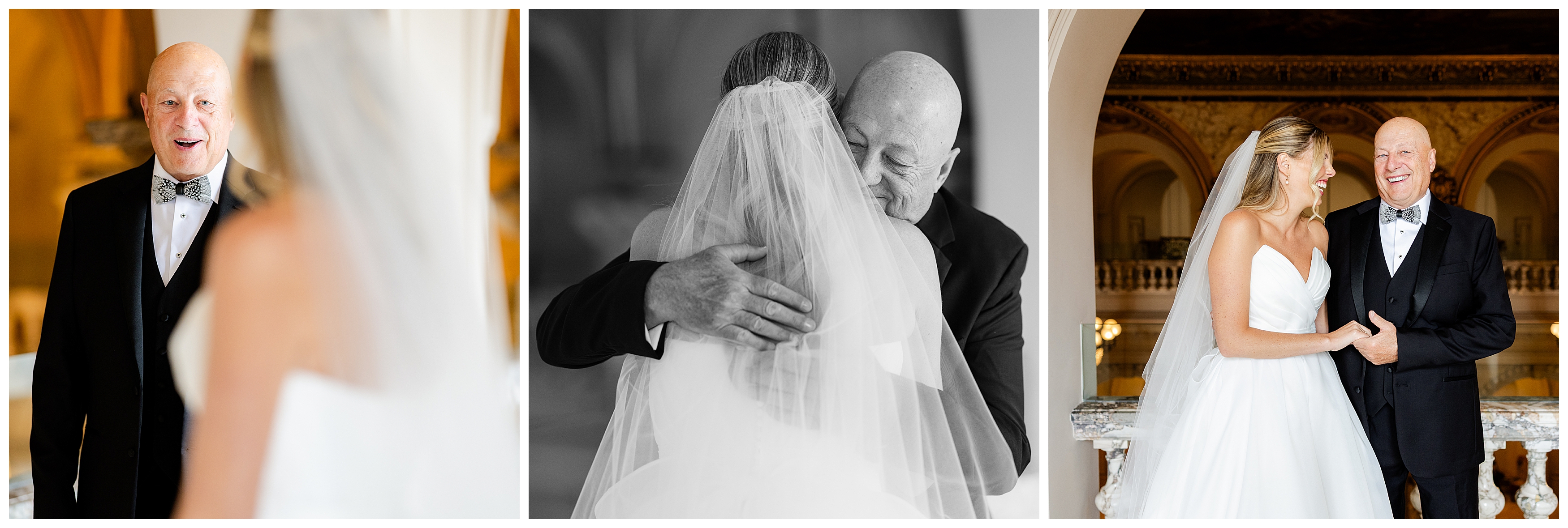 Madison and Dan’s black-tie wedding at Elkins Estate was the perfect blend of timeless elegance and joyful celebration just outside of Philadelphia. Elkins Estate offers breathtaking architecture, grand staircases, and ornate interiors that feel straight out of Europe. Madison and Dan fell in love with the history and atmosphere of the space (as did I!). The setting paired beautifully with their chic vision—classic florals, a refined black-and-white palette, and bridesmaids dressed in beautiful gowns finished with elegant black bows cascading down the back, a sweet nod to the bow featured on Madison’s gown. Every detail felt intentional, stylish, and effortlessly classic.