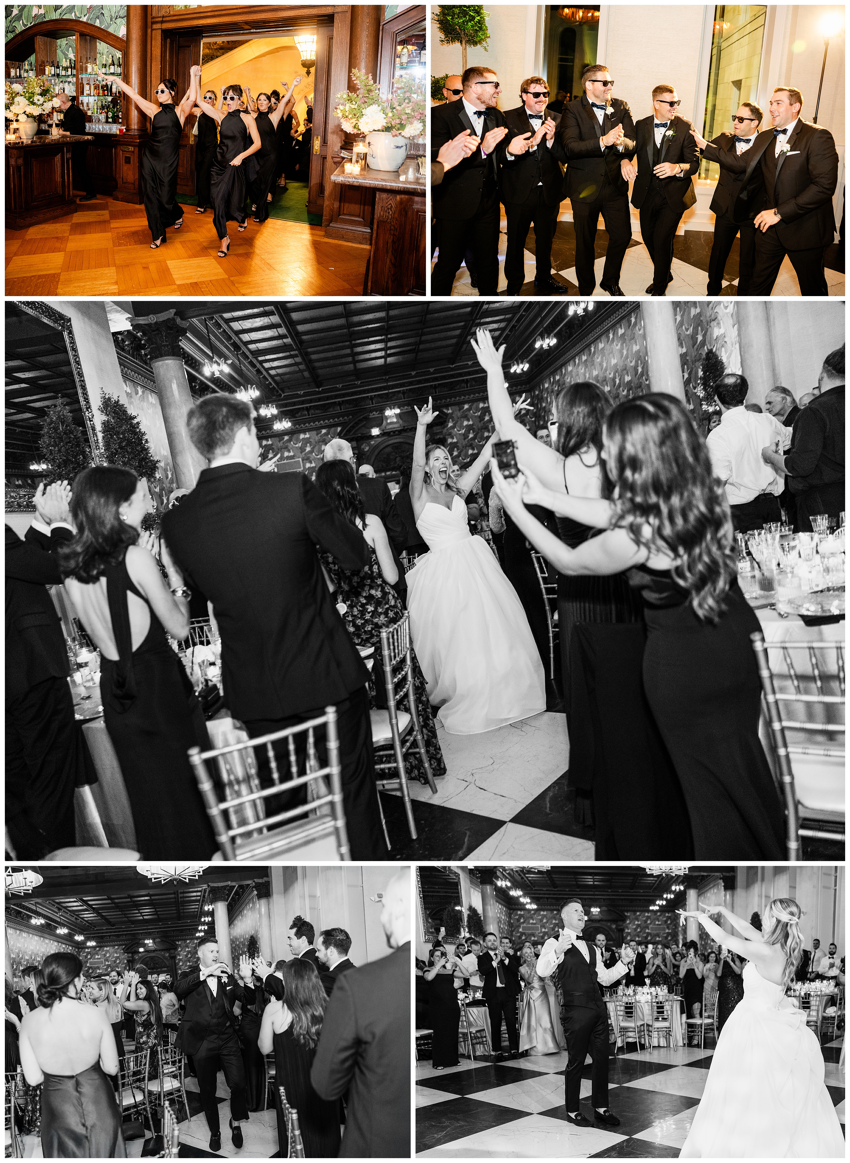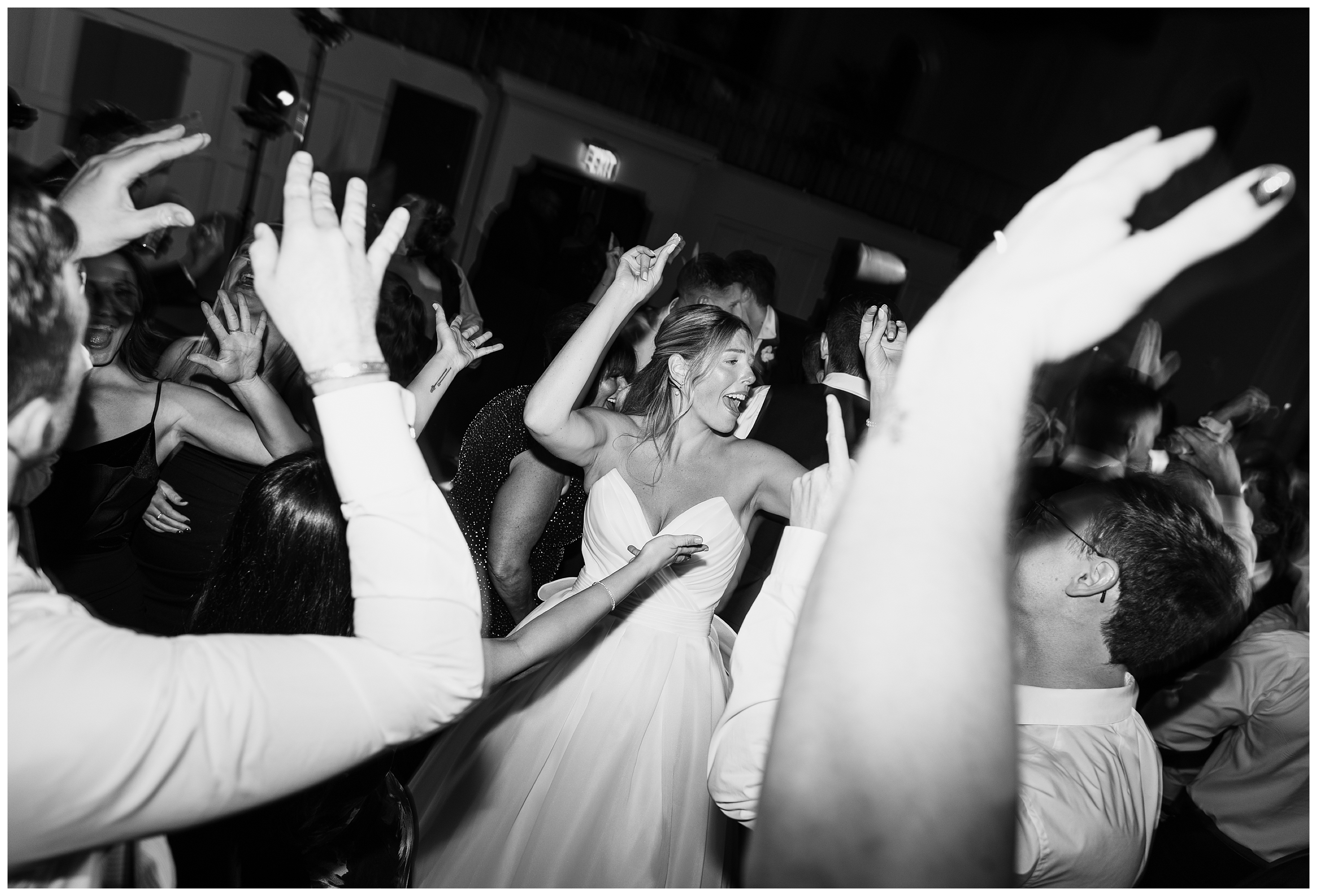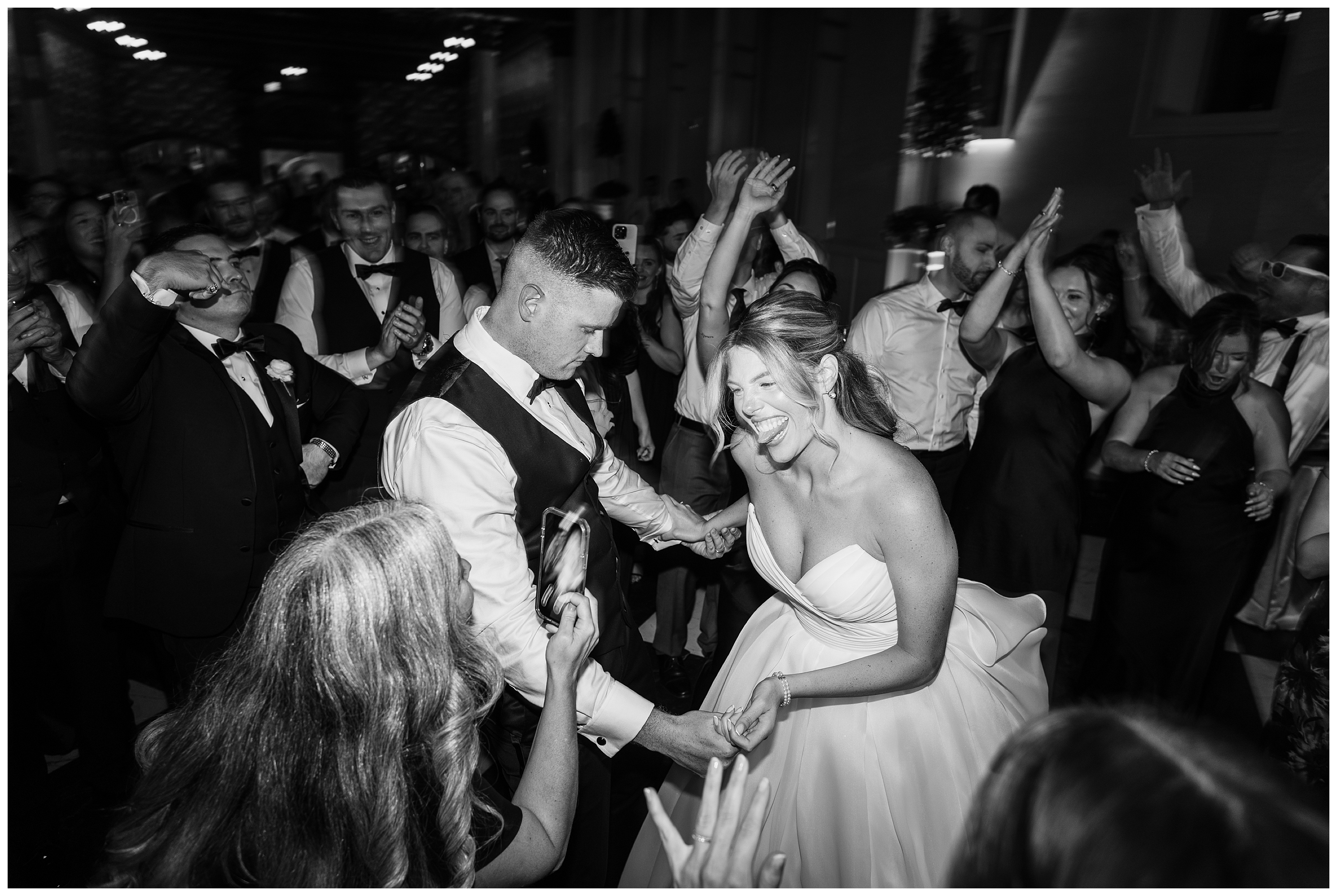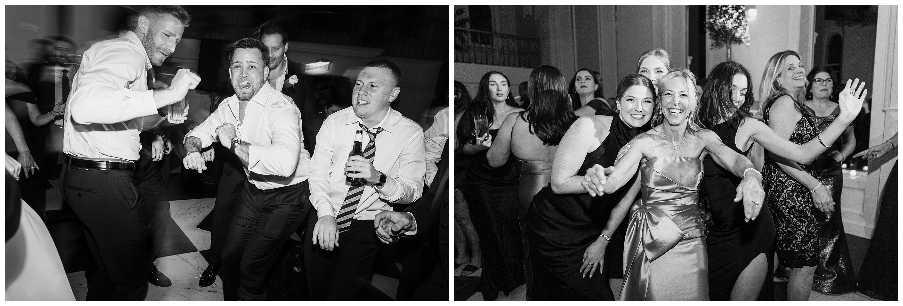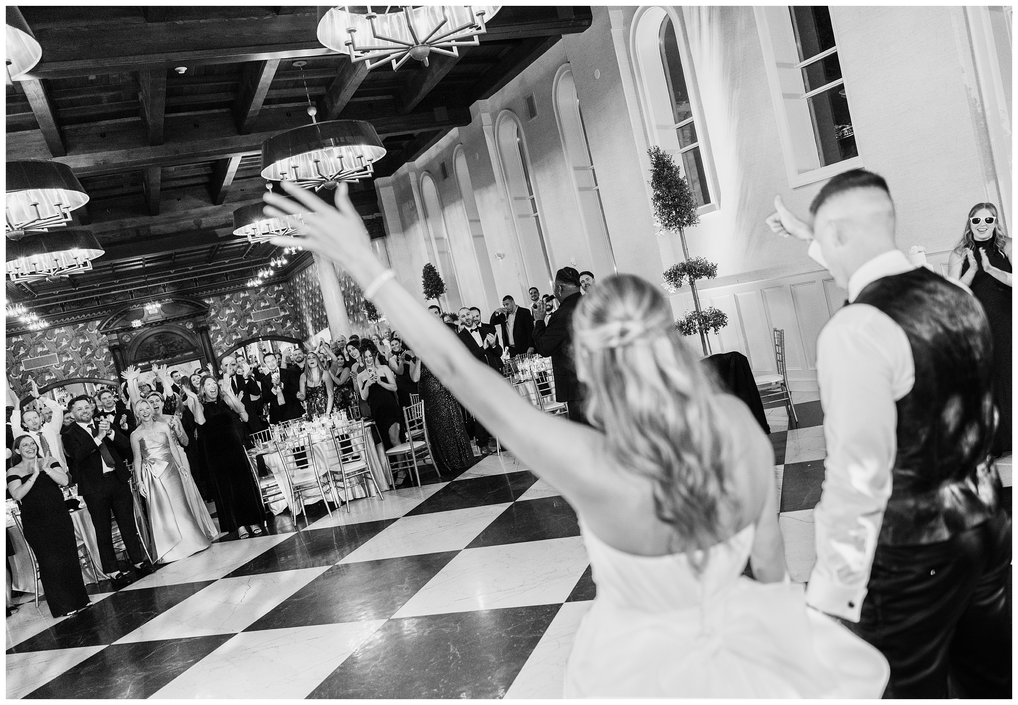 The reception was the perfect balance of chic sophistication and pure fun. Madison and Dan surprised everyone with a choreographed first dance that was both graceful and high-energy, setting the tone for an unforgettable night. With a live band filling the grand ballroom and guests packed onto the dance floor, their Elkins Estate wedding reception was vibrant, joyful, and full of life. It was a celebration that felt deeply personal yet undeniably elegant – what an honor to document the beginning of this next chapter in their lives as husband and wife!