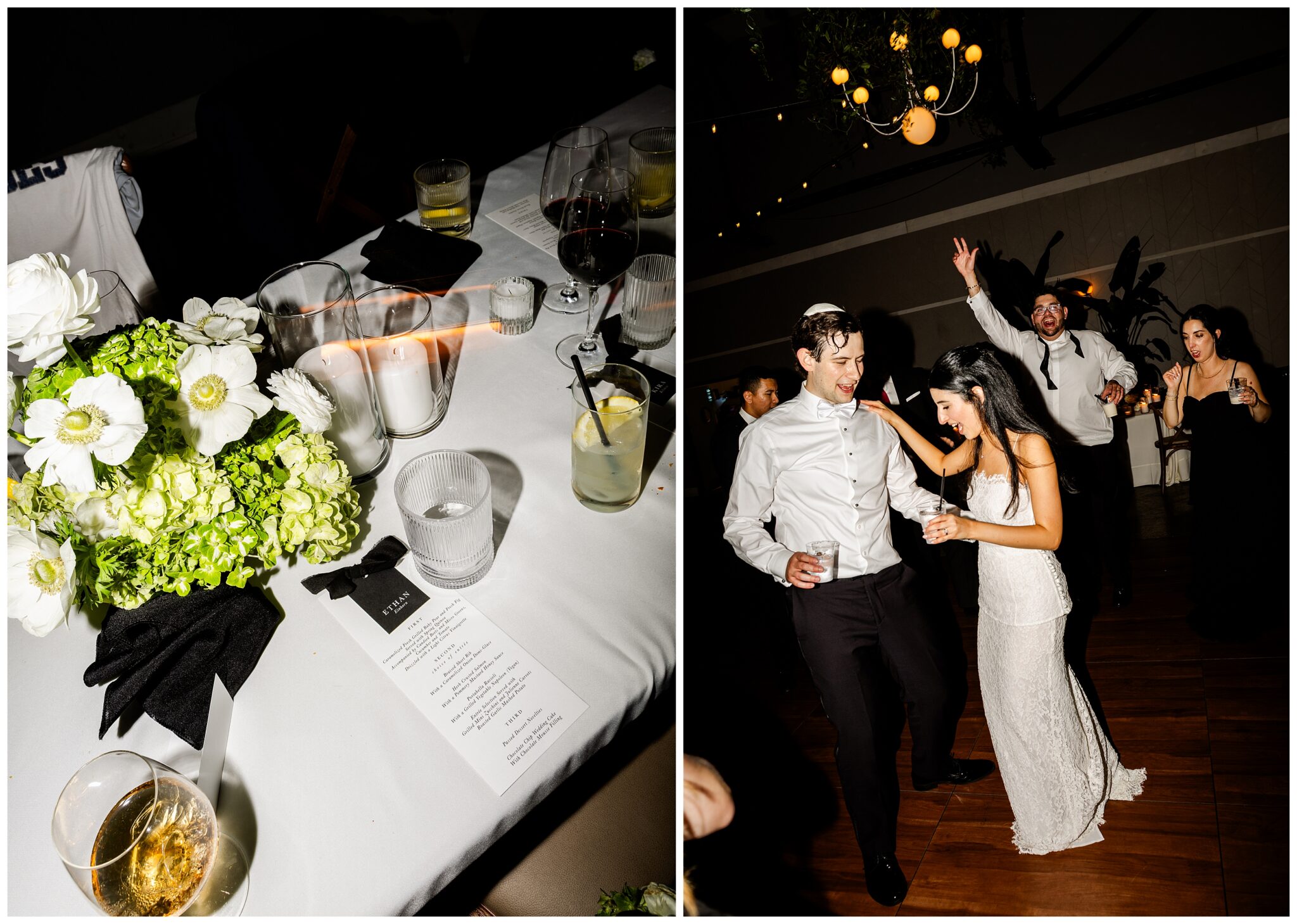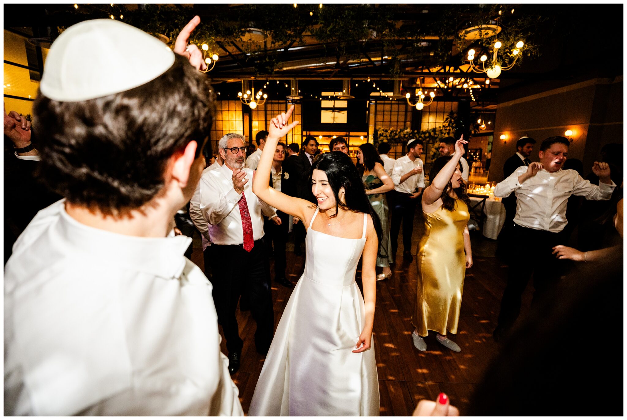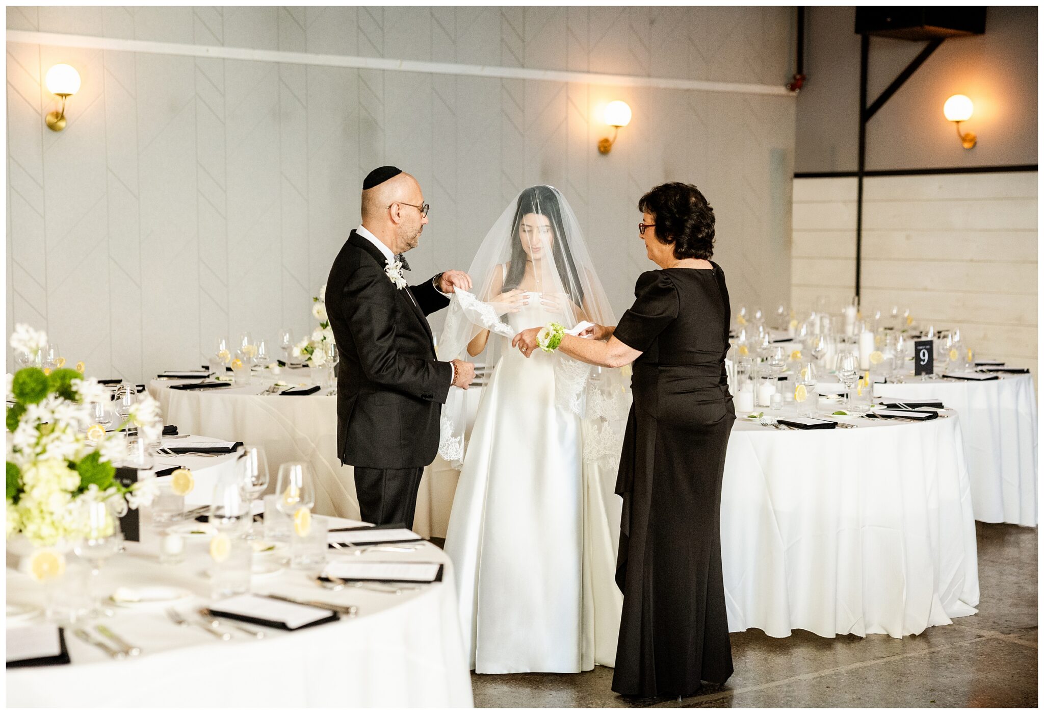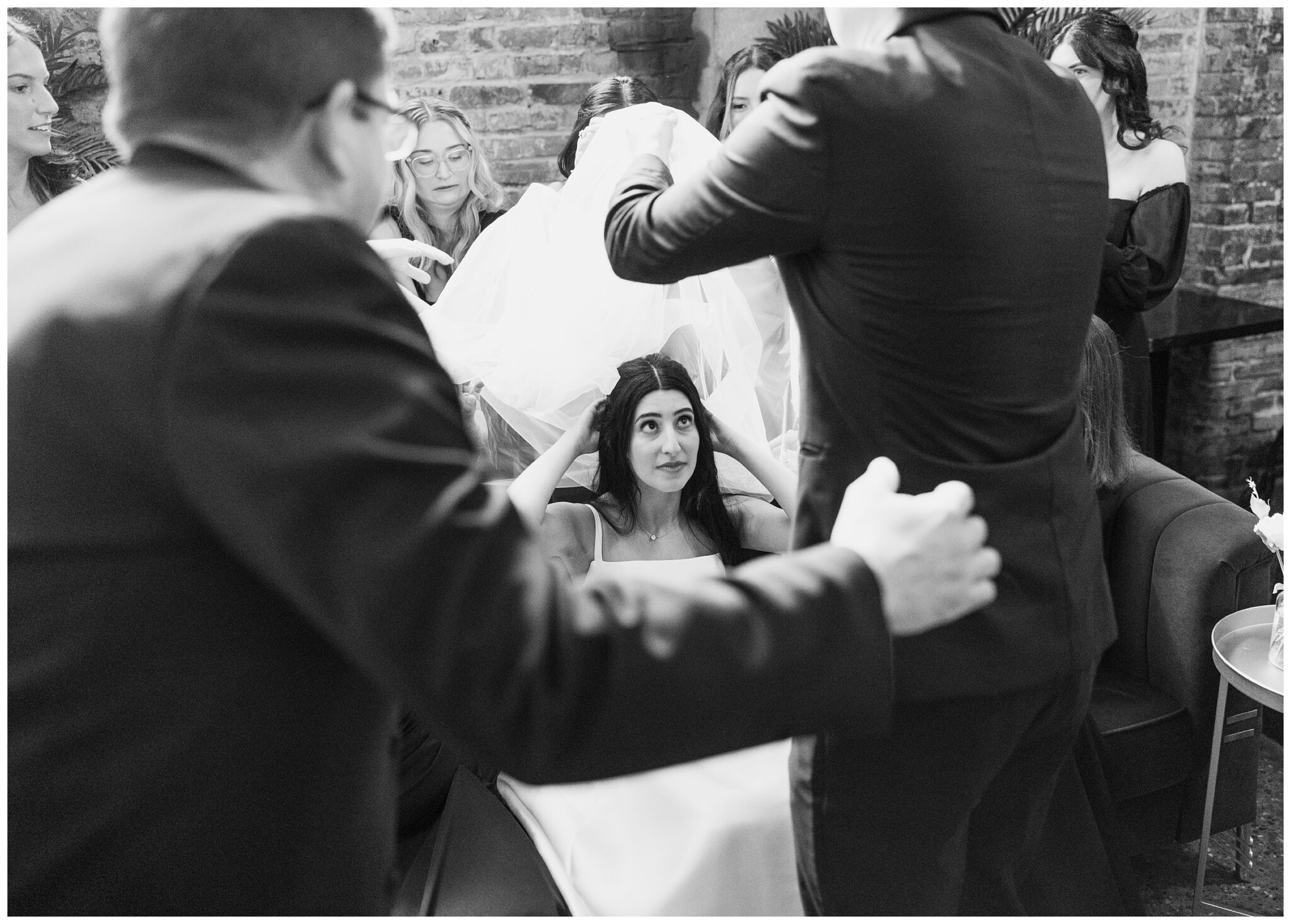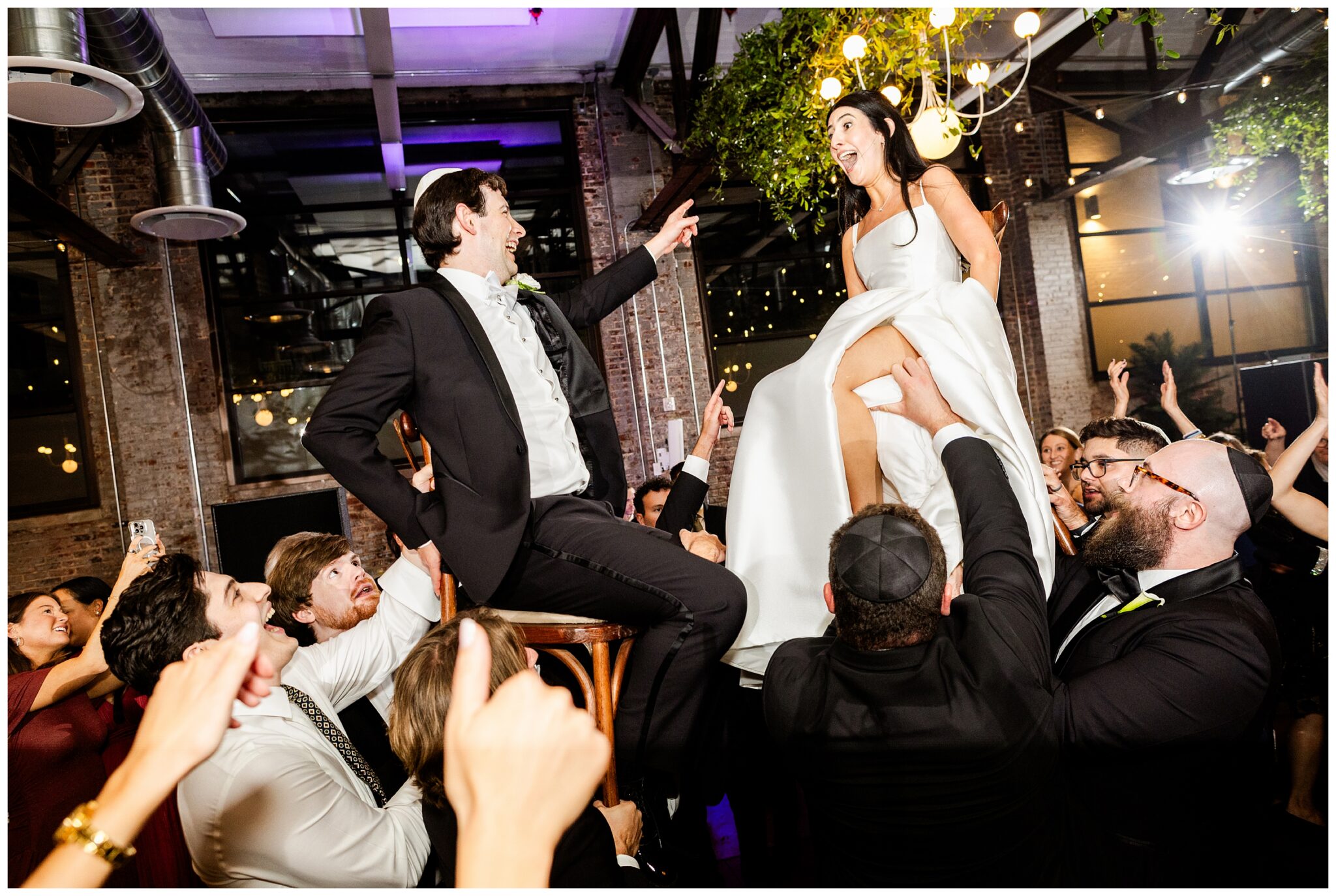 Their wedding beautifully honored Jewish traditions that added so much meaning to the day. Before the ceremony, Tali and Max signed the ketubah followed by family and friends gathered for the tish and bedekin. Celebration erupted from the loft as Tali was downstairs being greeted by guests surrounded by the mother’s grandmother’s, and her bridesmeaids. It culminated in an energectic moment of dance as Max came down from the loft to greet Tali in a touching moment where he lowered her veil and whisker her away to their beautiful ceremony. Later in the evening, Tali and Max pulled open the doors to the reception and invited guests into the space where the dance floor erupted for the hora, with guests lifting Tali and Max in chairs while everyone danced in joyful circles around them. One of the most delightful traditions that followed was a mezinke moment where the couple sat and guests performed playful dances to entertain them — an incredibly fun and lighthearted way to celebrate the newlyweds.