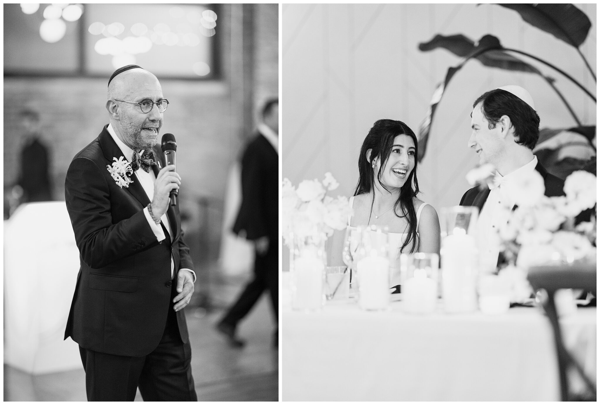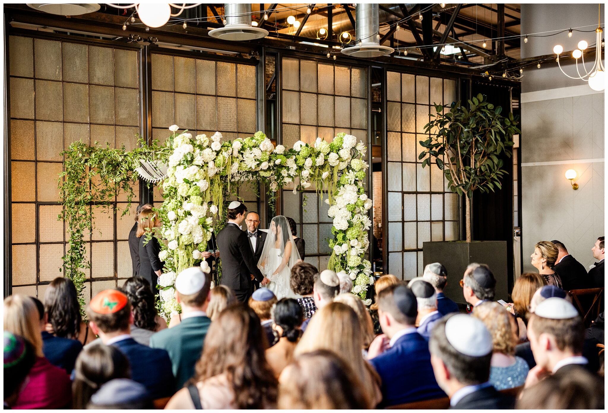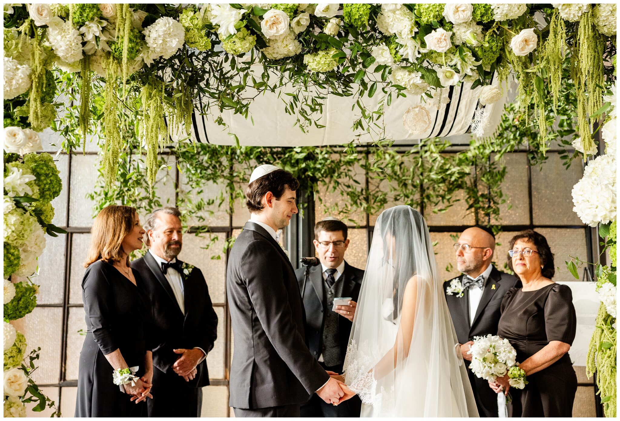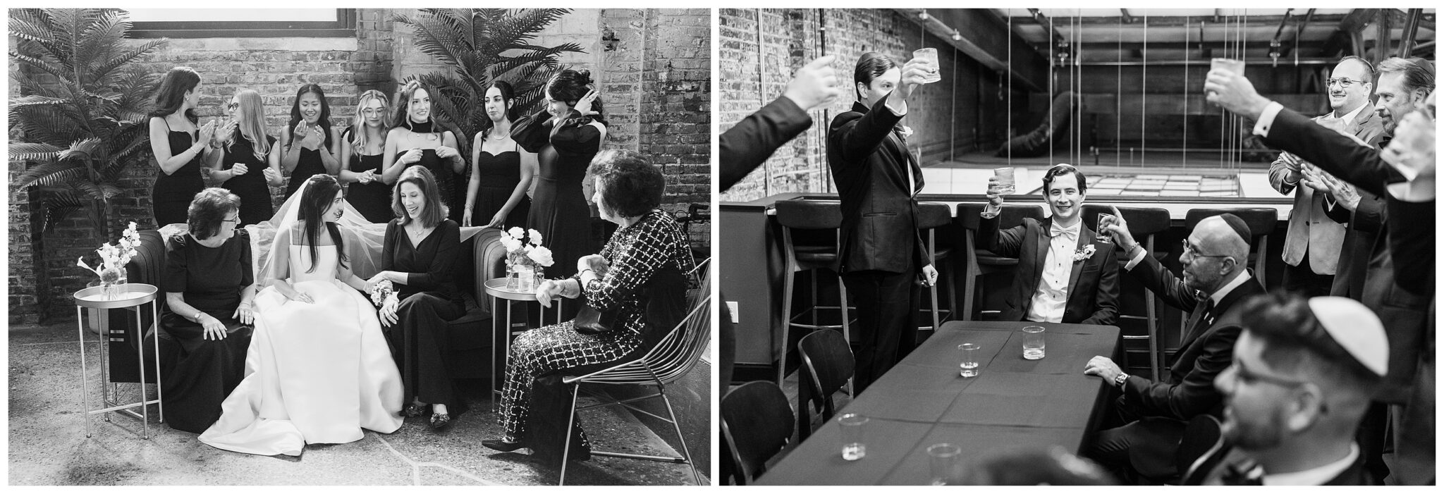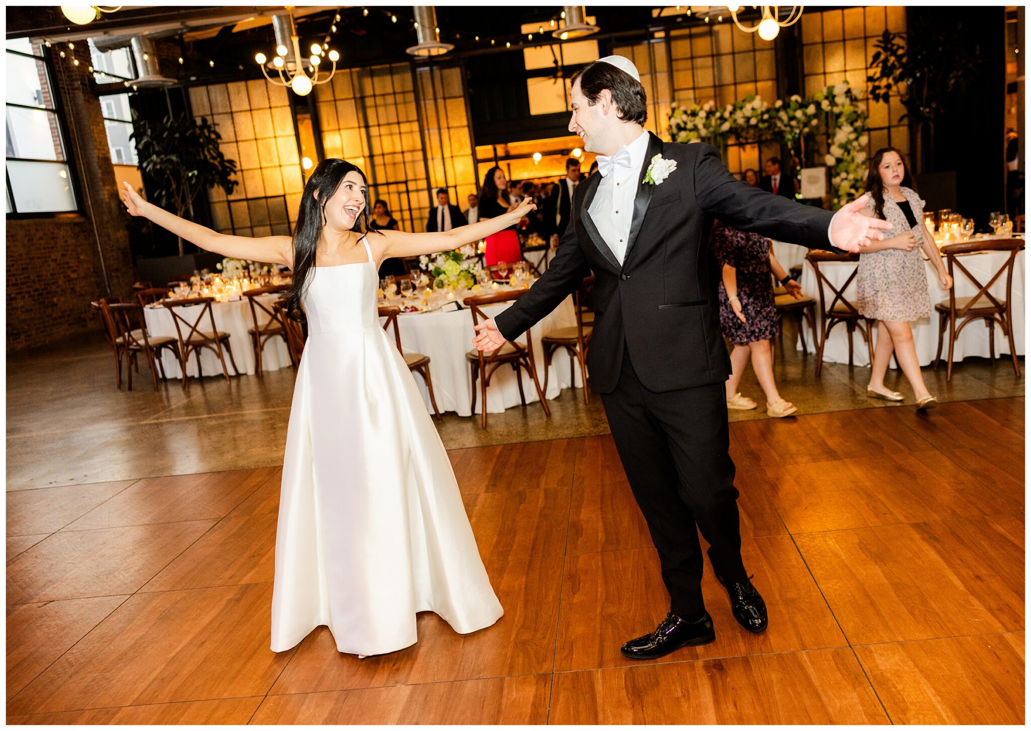 Their wedding beautifully honored Jewish traditions that added so much meaning to the day. Before the ceremony, Tali and Max signed the ketubah followed by family and friends gathered for the tish and bedekin. Celebration erupted from the loft as Tali was downstairs being greeted by guests surrounded by the mother’s grandmother’s, and her bridesmeaids. It culminated in an energectic moment of dance as Max came down from the loft to greet Tali in a touching moment where he lowered her veil and whisker her away to their beautiful ceremony. Later in the evening, Tali and Max pulled open the doors to the reception and invited guests into the space where the dance floor erupted for the hora, with guests lifting Tali and Max in chairs while everyone danced in joyful circles around them. One of the most delightful traditions that followed was a mezinke moment where the couple sat and guests performed playful dances to entertain them — an incredibly fun and lighthearted way to celebrate the newlyweds.