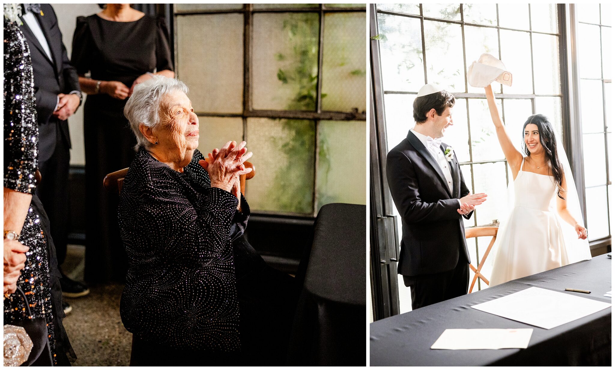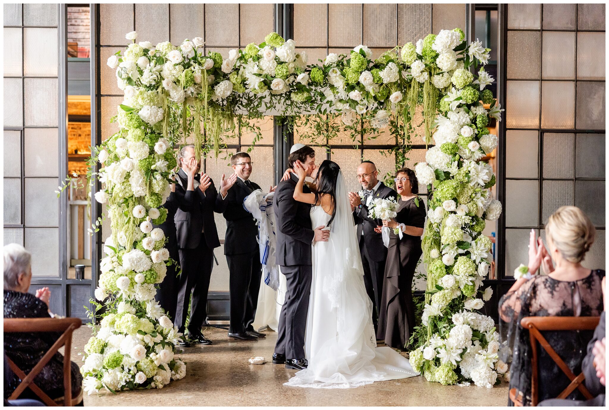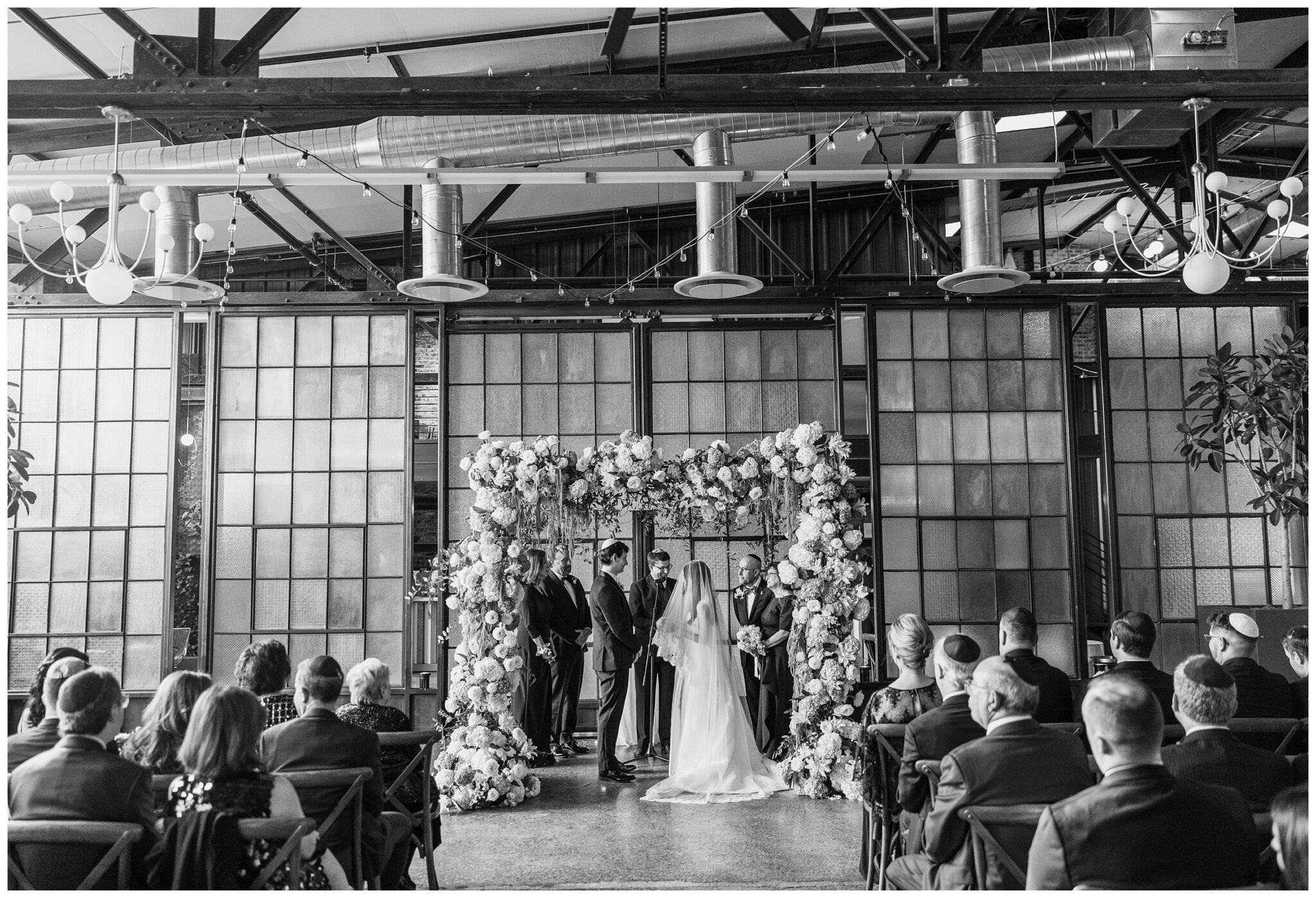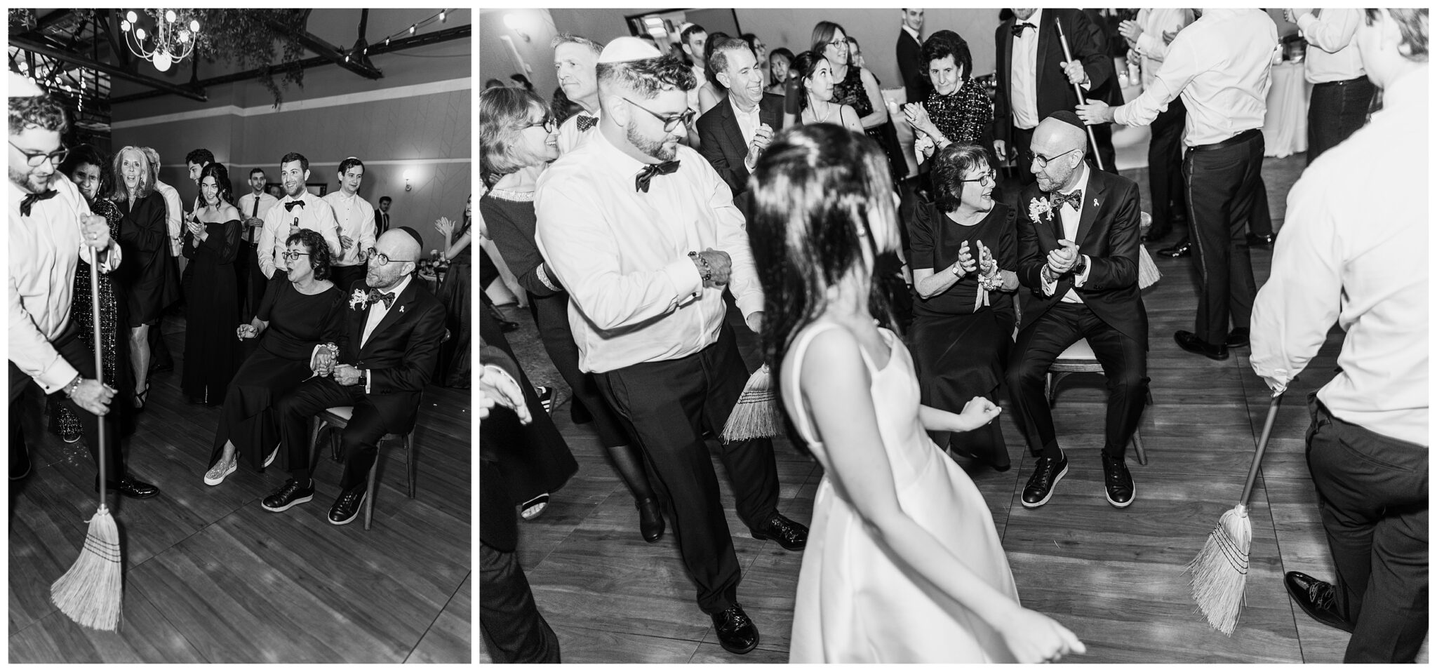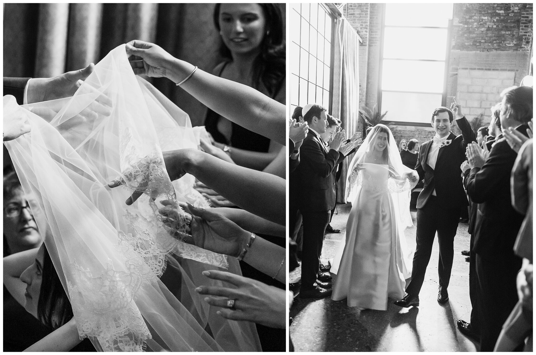 Their wedding beautifully honored Jewish traditions that added so much meaning to the day. Before the ceremony, Tali and Max signed the ketubah followed by family and friends gathered for the tish and bedekin. Celebration erupted from the loft as Tali was downstairs being greeted by guests surrounded by the mother’s grandmother’s, and her bridesmeaids. It culminated in an energectic moment of dance as Max came down from the loft to greet Tali in a touching moment where he lowered her veil and whisker her away to their beautiful ceremony. Later in the evening, Tali and Max pulled open the doors to the reception and invited guests into the space where the dance floor erupted for the hora, with guests lifting Tali and Max in chairs while everyone danced in joyful circles around them. One of the most delightful traditions that followed was a mezinke moment where the couple sat and guests performed playful dances to entertain them — an incredibly fun and lighthearted way to celebrate the newlyweds.