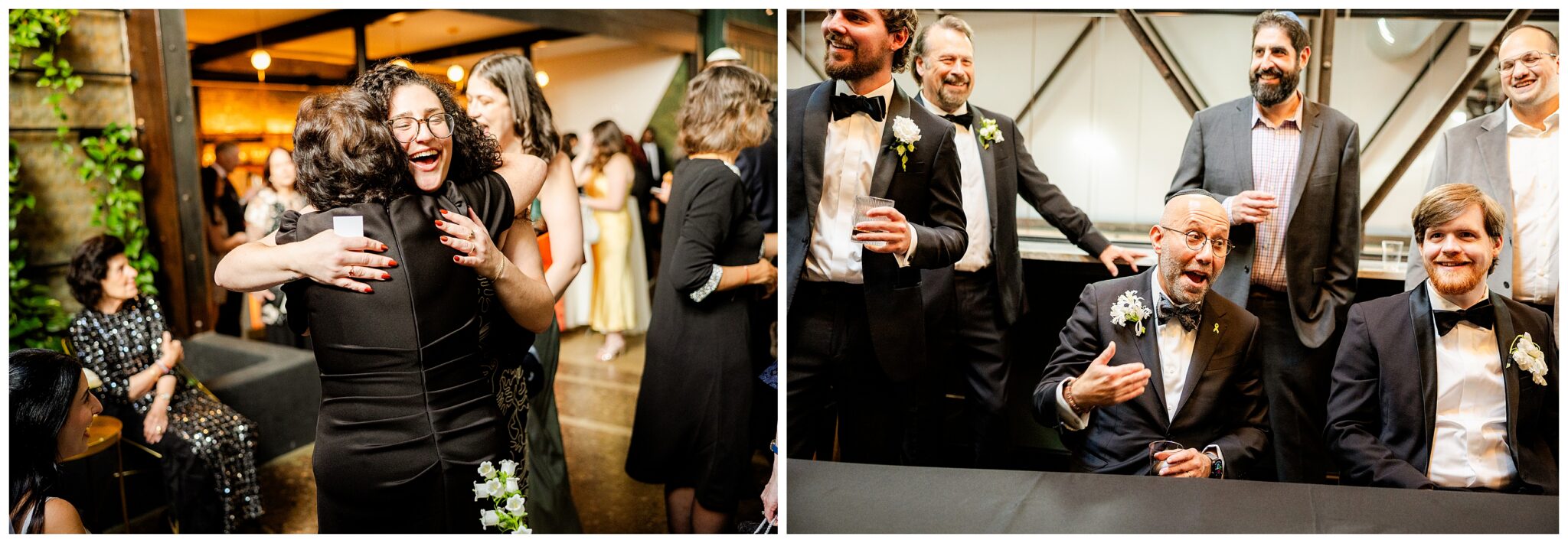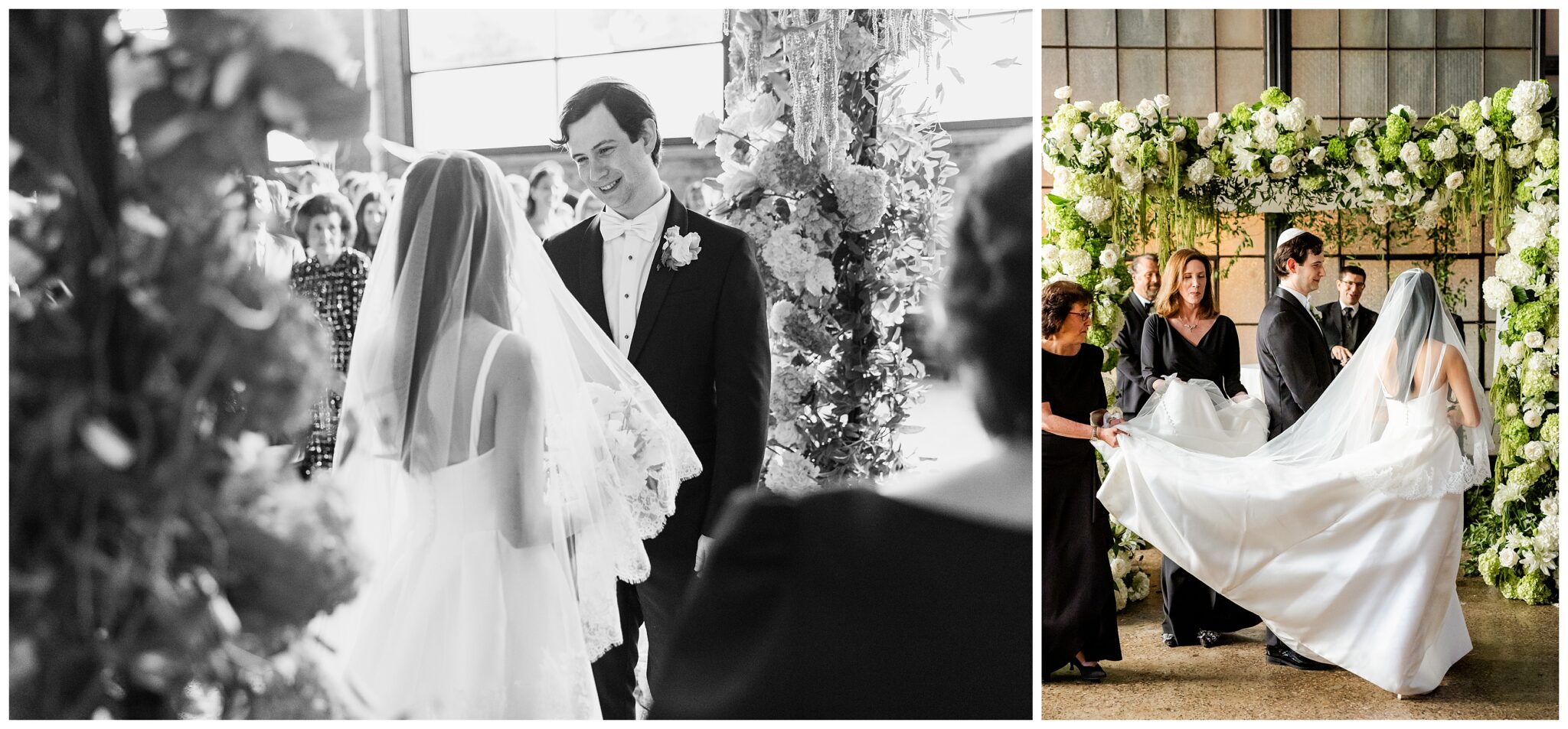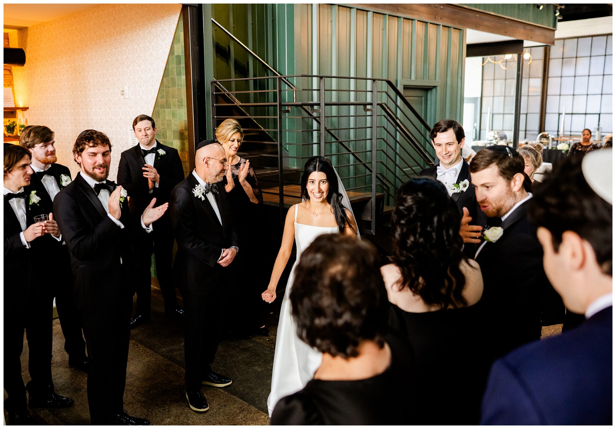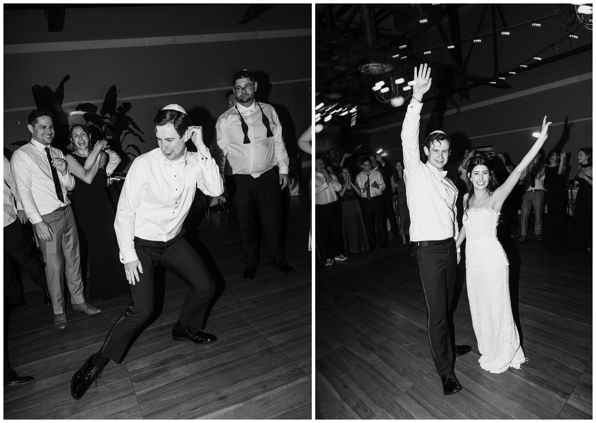 Their wedding beautifully honored Jewish traditions that added so much meaning to the day. Before the ceremony, Tali and Max signed the ketubah followed by family and friends gathered for the tish and bedekin. Celebration erupted from the loft as Tali was downstairs being greeted by guests surrounded by the mother’s grandmother’s, and her bridesmeaids. It culminated in an energectic moment of dance as Max came down from the loft to greet Tali in a touching moment where he lowered her veil and whisker her away to their beautiful ceremony. Later in the evening, Tali and Max pulled open the doors to the reception and invited guests into the space where the dance floor erupted for the hora, with guests lifting Tali and Max in chairs while everyone danced in joyful circles around them. One of the most delightful traditions that followed was a mezinke moment where the couple sat and guests performed playful dances to entertain them — an incredibly fun and lighthearted way to celebrate the newlyweds.