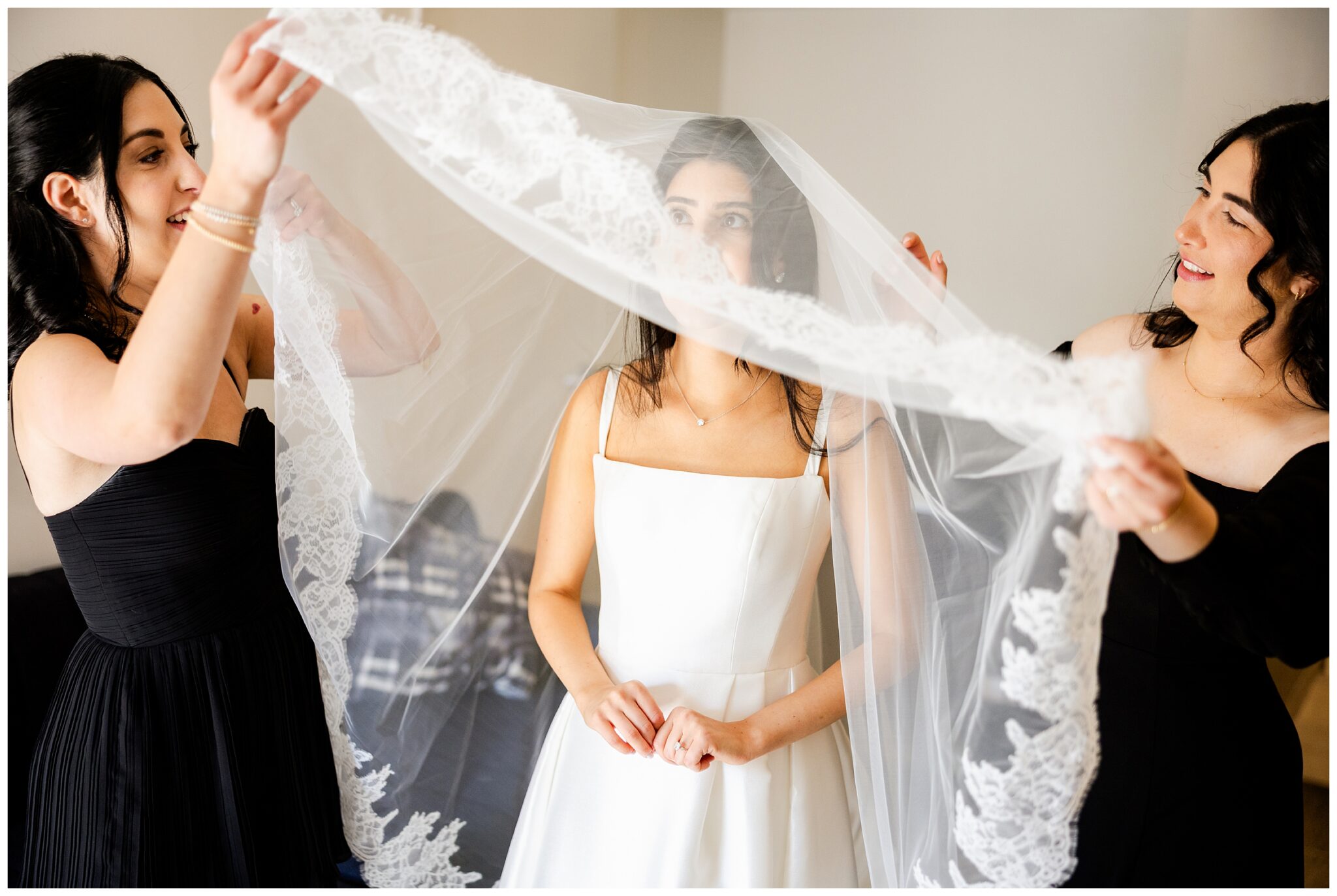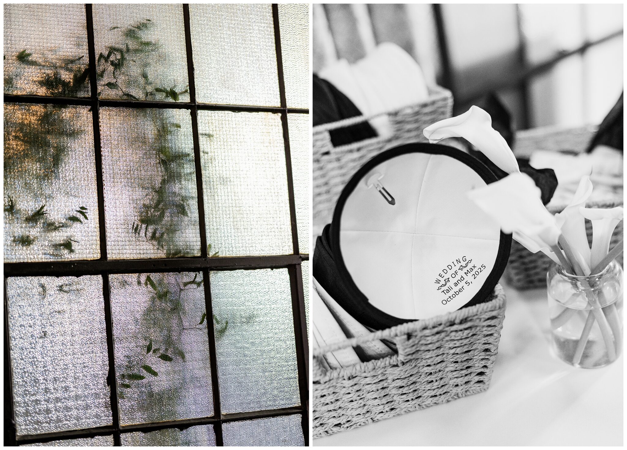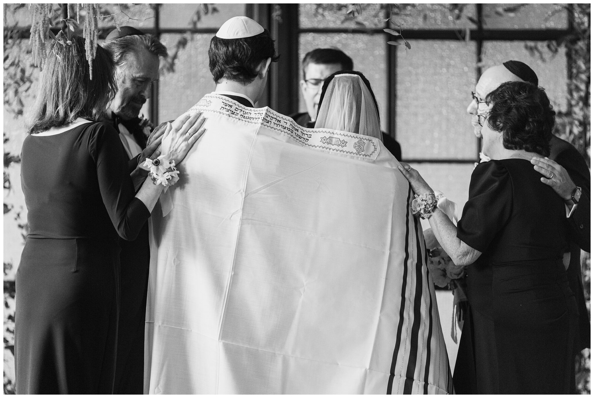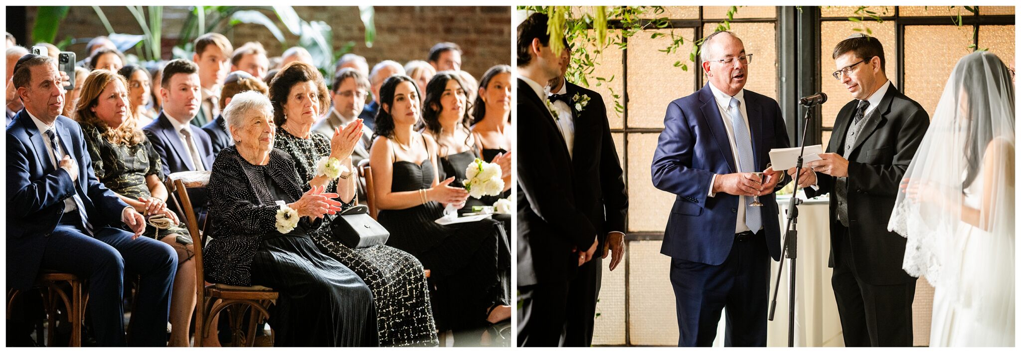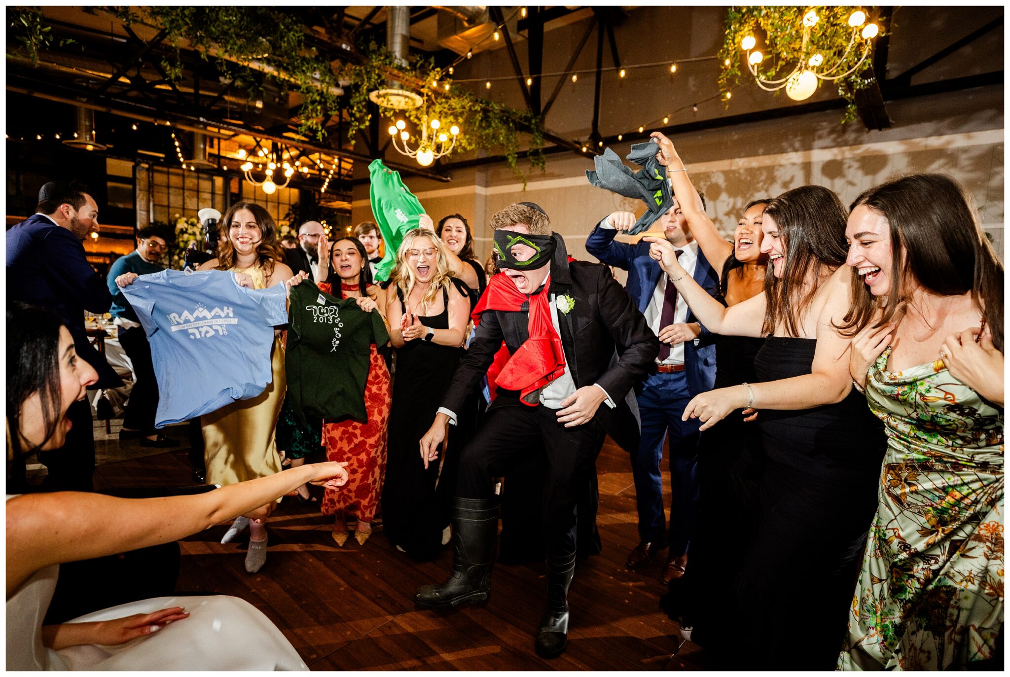Their wedding beautifully honored Jewish traditions that added so much meaning to the day. Before the ceremony, Tali and Max signed the ketubah followed by family and friends gathered for the tish and bedekin. Celebration erupted from the loft as Tali was downstairs being greeted by guests surrounded by the mother’s grandmother’s, and her bridesmeaids. It culminated in an energectic moment of dance as Max came down from the loft to greet Tali in a touching moment where he lowered her veil and whisker her away to their beautiful ceremony. Later in the evening, Tali and Max pulled open the doors to the reception and invited guests into the space where the dance floor erupted for the hora, with guests lifting Tali and Max in chairs while everyone danced in joyful circles around them. One of the most delightful traditions that followed was a mezinke moment where the couple sat and guests performed playful dances to entertain them — an incredibly fun and lighthearted way to celebrate the newlyweds.