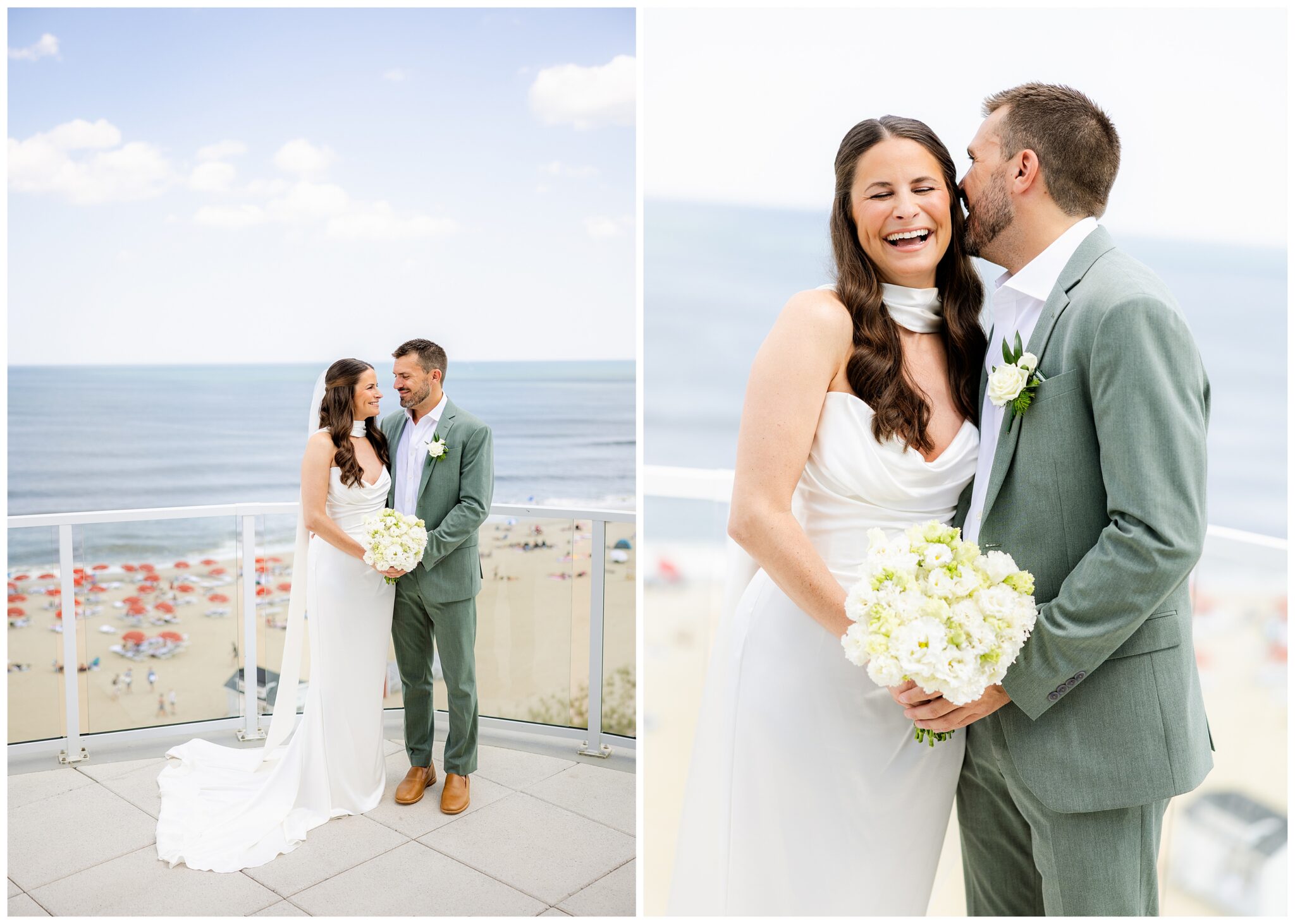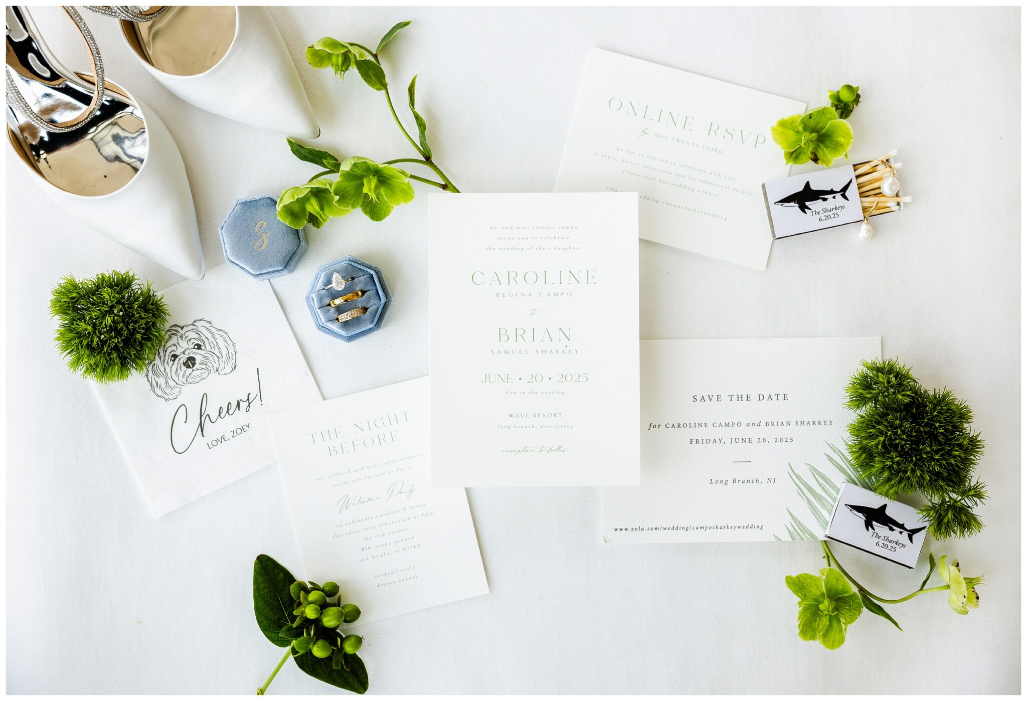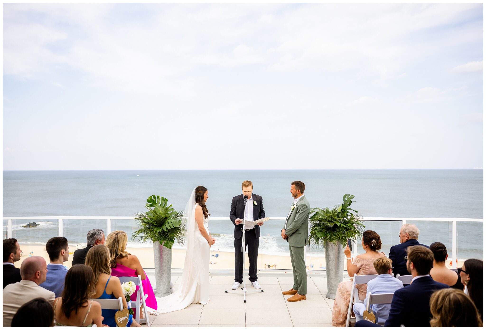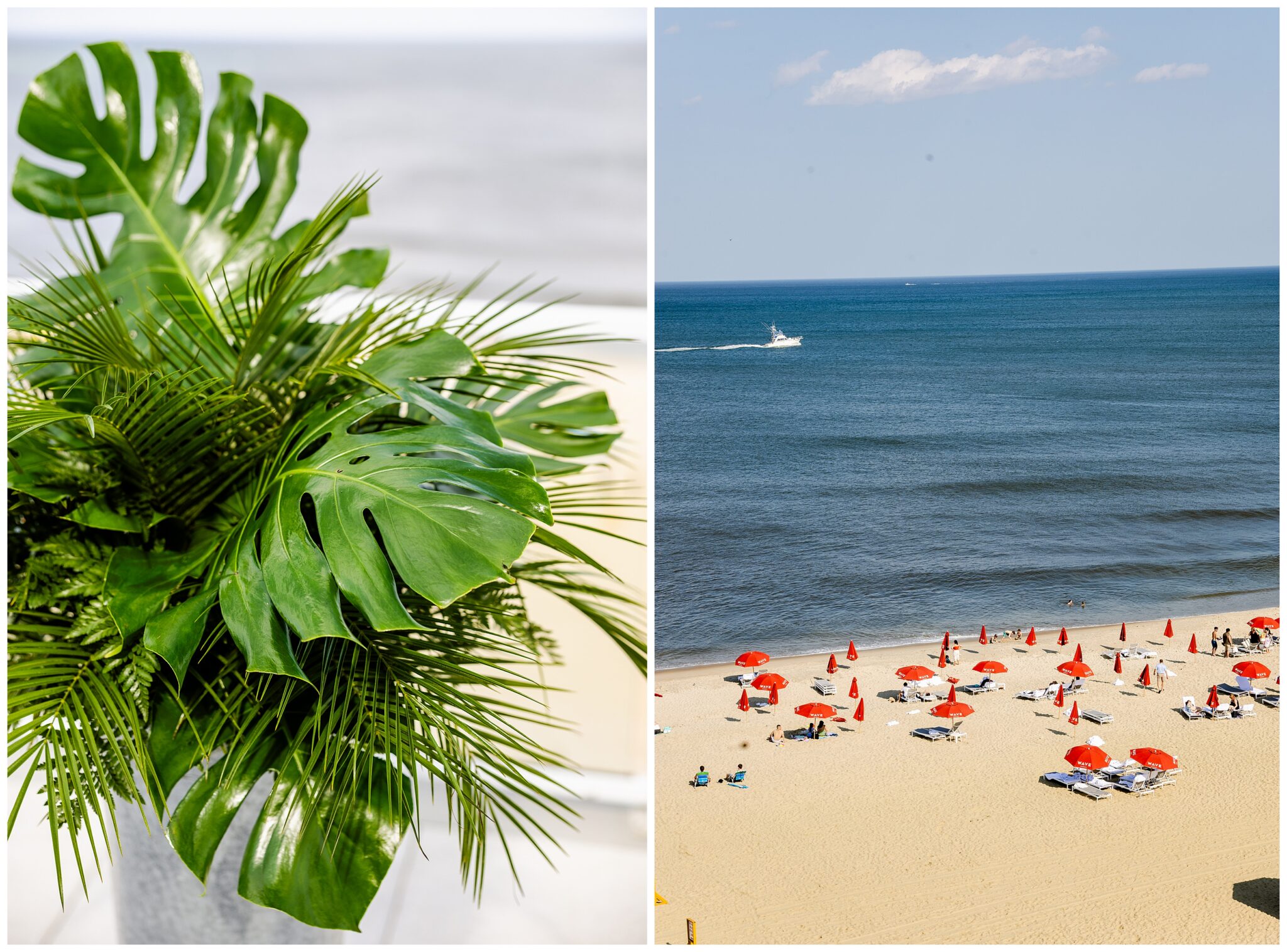 The design and style of the day perfectly matched the setting. Brian’s linen suit felt effortlessly coastal and elevated, while Caroline stunned in a sleek bridal look before changing into a chic second dress just before cake cutting. We captured so many of their portraits at the resort’s signature bar — a space with a fun, Miami-inspired feel that couldn’t have been more “them.” From the oceanfront views to the modern design, this Long Branch, NJ beach wedding was the perfect blend of relaxed and celebratory.